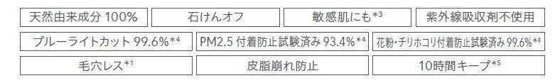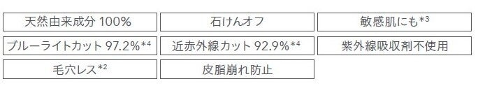 *1:使用感として *2:メイクアップ効果による *3:敏感肌パッチテスト済み。すべての方に皮膚刺激が起こらないとい うわけではありません。 *4:第三者機関実施試験結果より *5:紫外線・ブルーライト*⁴・近赤外線*⁴ *6:ハッカ葉油(香料) *7:レモン果皮油(香料) *8:ハッカ葉油、レモン果皮油(香料) *9:UVプロテクションベースS