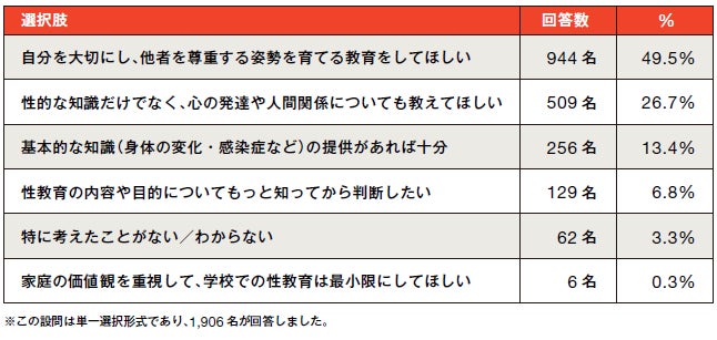 全国の高校生の保護者1,906 名から寄せられた「性・心・人間関係」に関する教育についての回答結果を分析したところ、保護者の多くが学校における段階的・体系的な性教育の実施を望む一方で、「どのように教えられているのか知りたい」という情報公開へのニーズも強いことが明らかになりました。