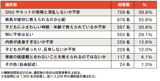 家庭の文化的・宗教的背景や価値観への配慮も重要で、「内容が家庭の考えと異なるのではないか」といった慎重な意見も一定数見られました。