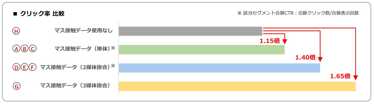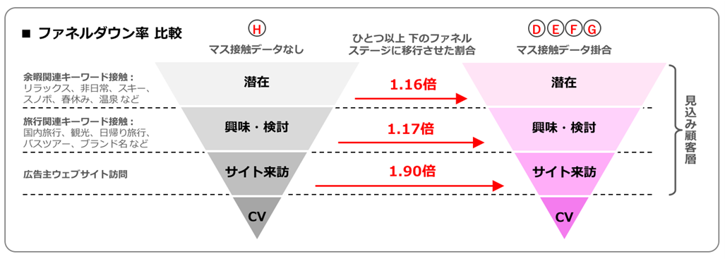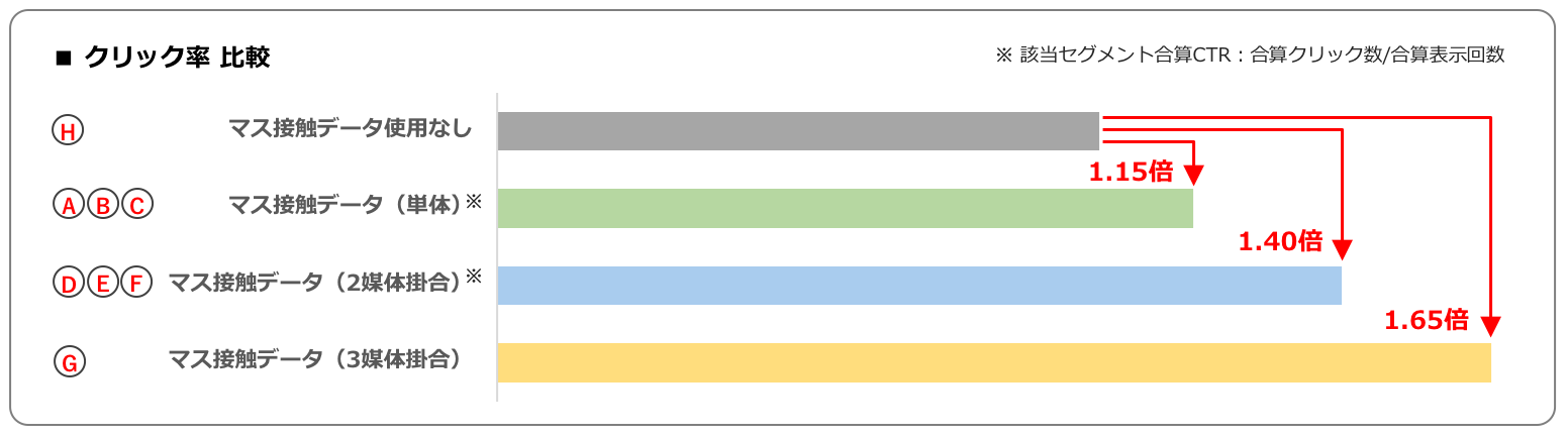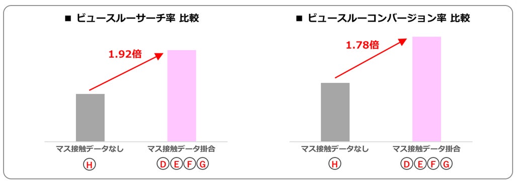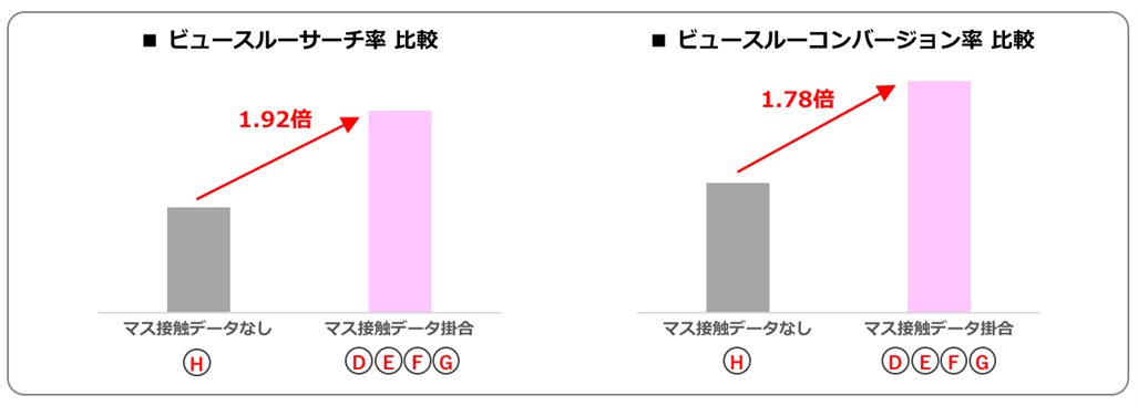 直接クリックに結びつかなくても、広告そのものに効果があったことを示す間接的な指標においても、マス接触データをかけ合わせて活用したセグメントD〜Gの方が、使用しなかった場合(H)に比べ、高い結果が得られました。検索行動への貢献度合いを示すビュースルーサーチ率では1.92倍、購買への貢献度を示すビュースルーコンバージョン率では1.78倍となりました。複数のマス接触データを組み合わせることで、より興味関心度の高いユーザーに効率よくリーチできることを示していると考えられます。