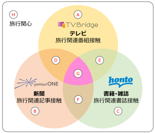 今回のサービス開始に先立って実施したテスト配信では、旅行会社の広告配信キャンペーンにおいて、「yomiuri ONE」、「honto」アクセスデータ、「TVBridge」の掛け合わせパターンに応じて、A〜Gの7つのターゲットセグメントを設定。マス接触データを使用しない興味関心ターゲティングであるセグメントHと比較して、広告配信結果がどの程度向上するか検証しました。主な結果は次のとおりです。