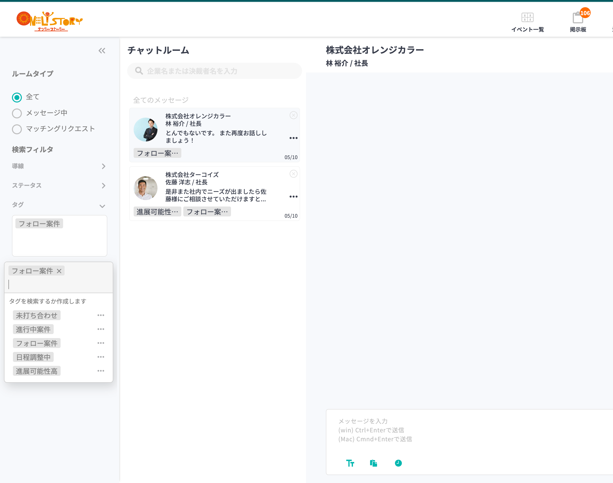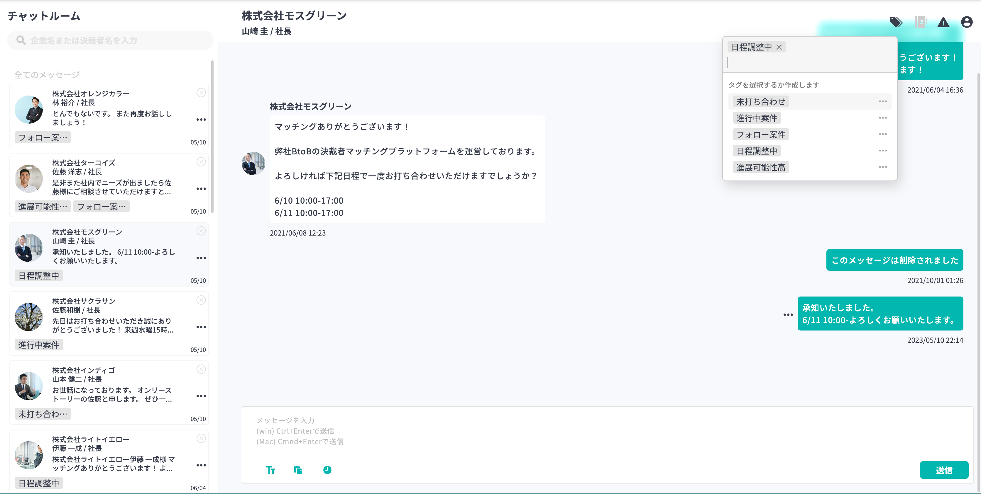 2023年4月の改修によって、マッチング以前のメッセージと対応中のメッセージを分けて表示する機能を搭載しました。同機能内では、当社が提供する複数の決裁者マッチング機能(紹介・イベント・掲示板等)のうちどの機能を経由してマッチングしたものかどうかも分けて表示できるようになりました。これによって、メッセージ管理・対応をより効率的に行うことができます。