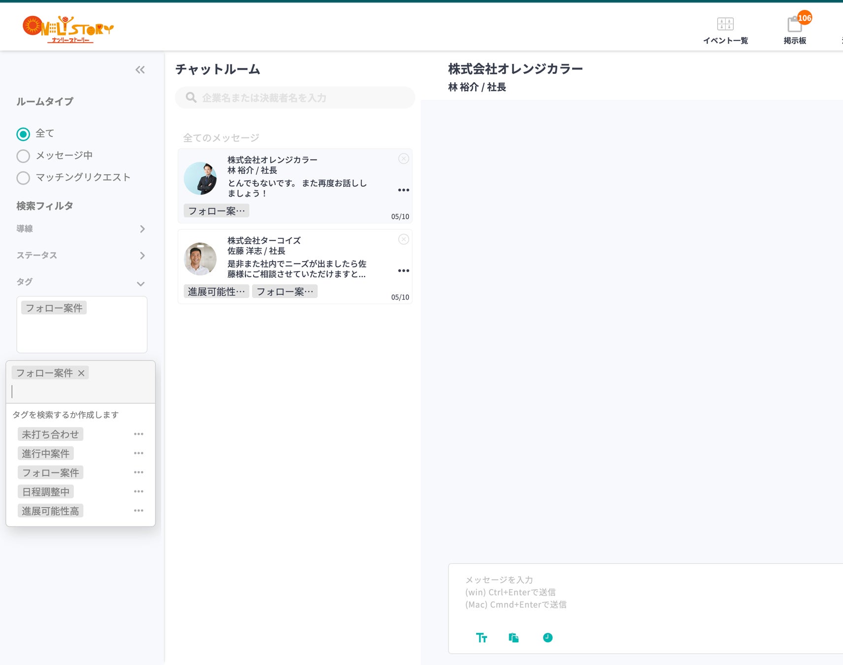管理したいラベル名でタグを作成し、やり取り中のチャットルームに割り当てが可能です。