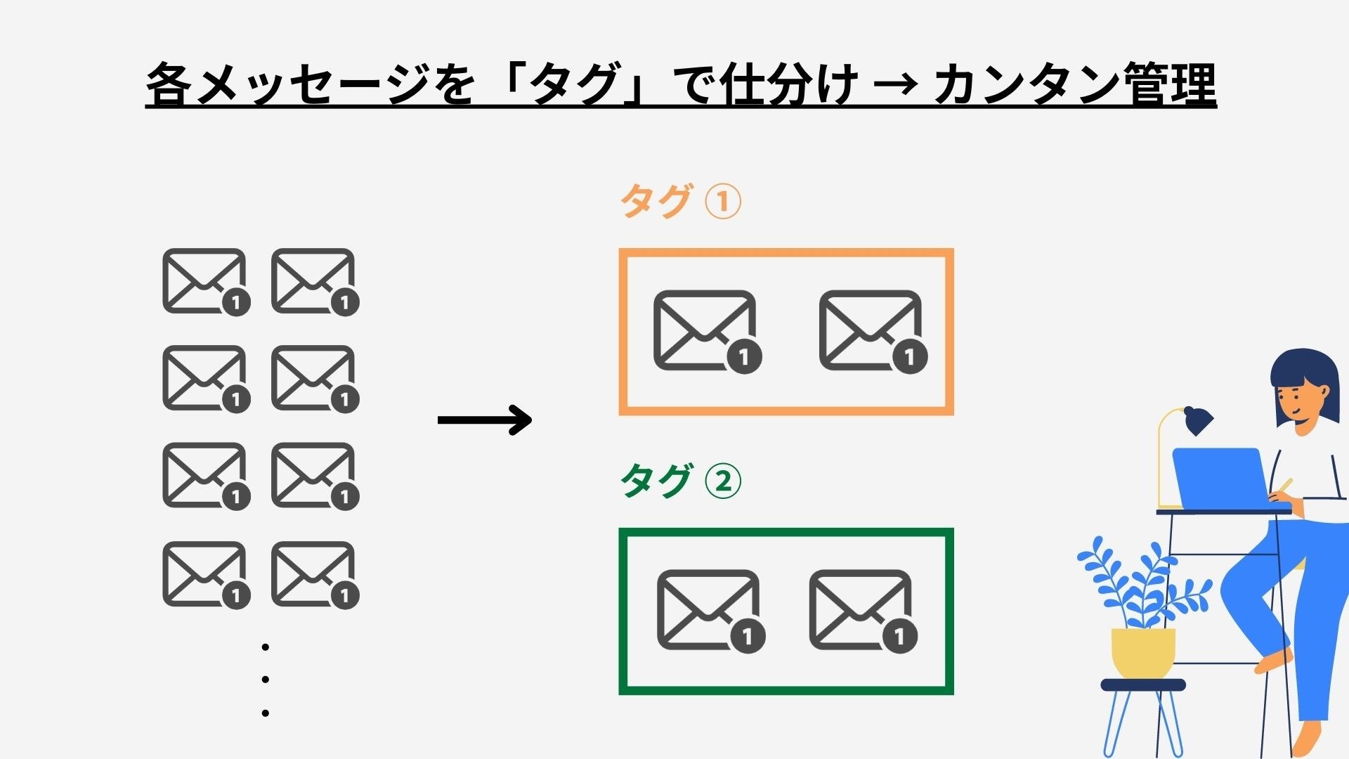 「タグ・ラベル」は、メッセージ画面にある作成ボタン・管理ボタンから簡単に新規作成・削除ができます。
