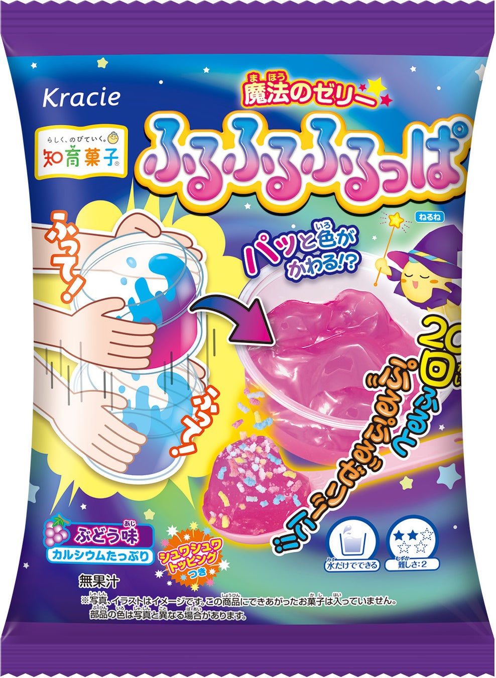 ・ カップに水と粉を入れてよく混ぜ、フタをして大きく20回振ると、色が変わってぷるぷるのゼリーになる不思議なお菓子。