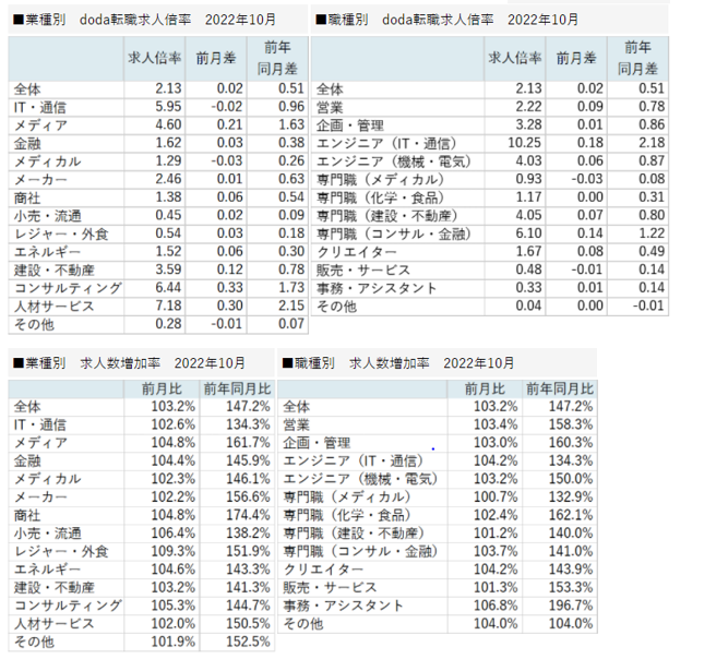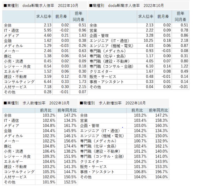 パーソルキャリア株式会社が運営する転職サービス「doda(デューダ)」(編集長:大浦 征也)は、2022年10月の転職求人倍率をまとめた「doda転職求人倍率」を発表いたします。