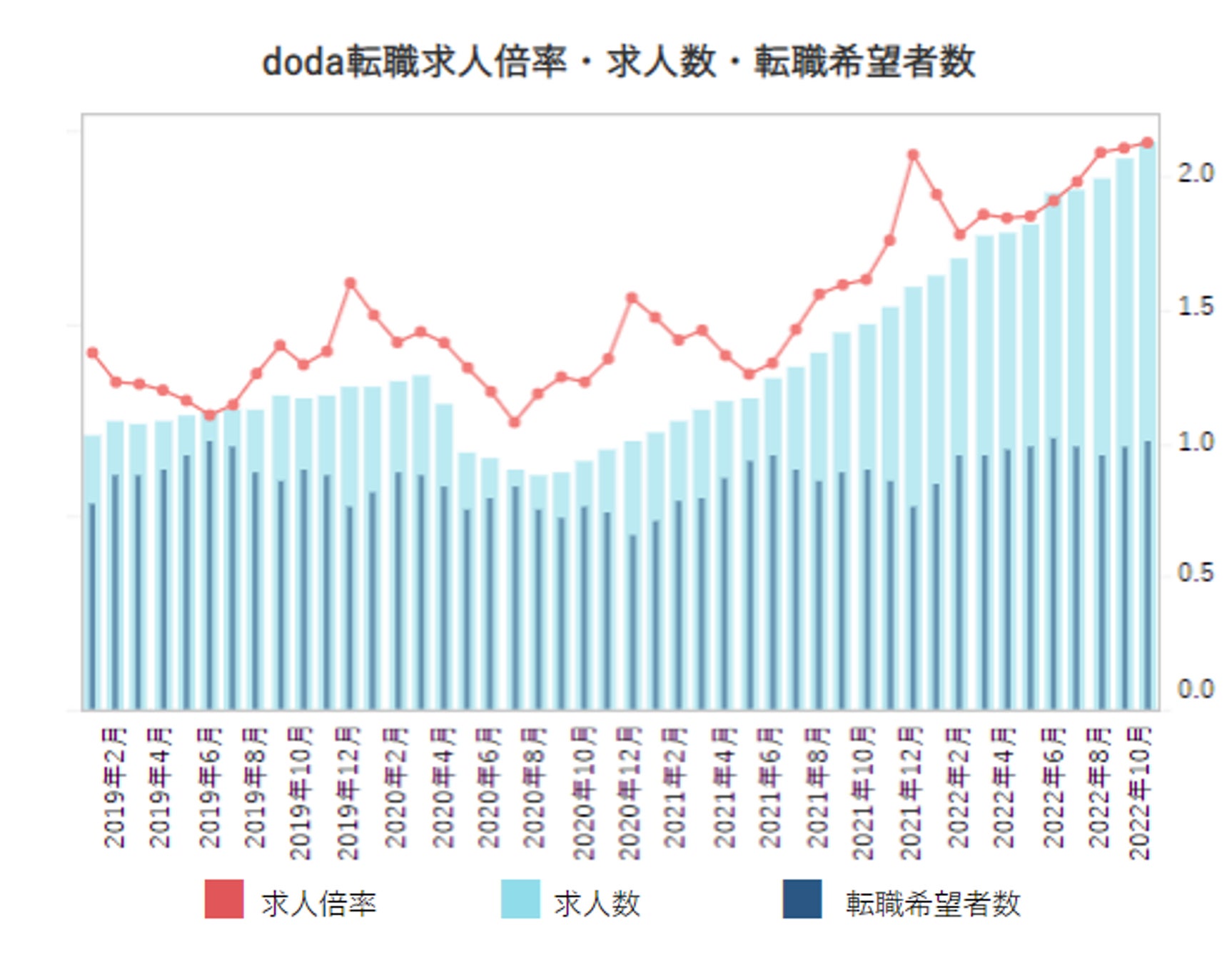 doda転職求人倍率2022年10月は2.13倍(前月差+0.02ポイント)