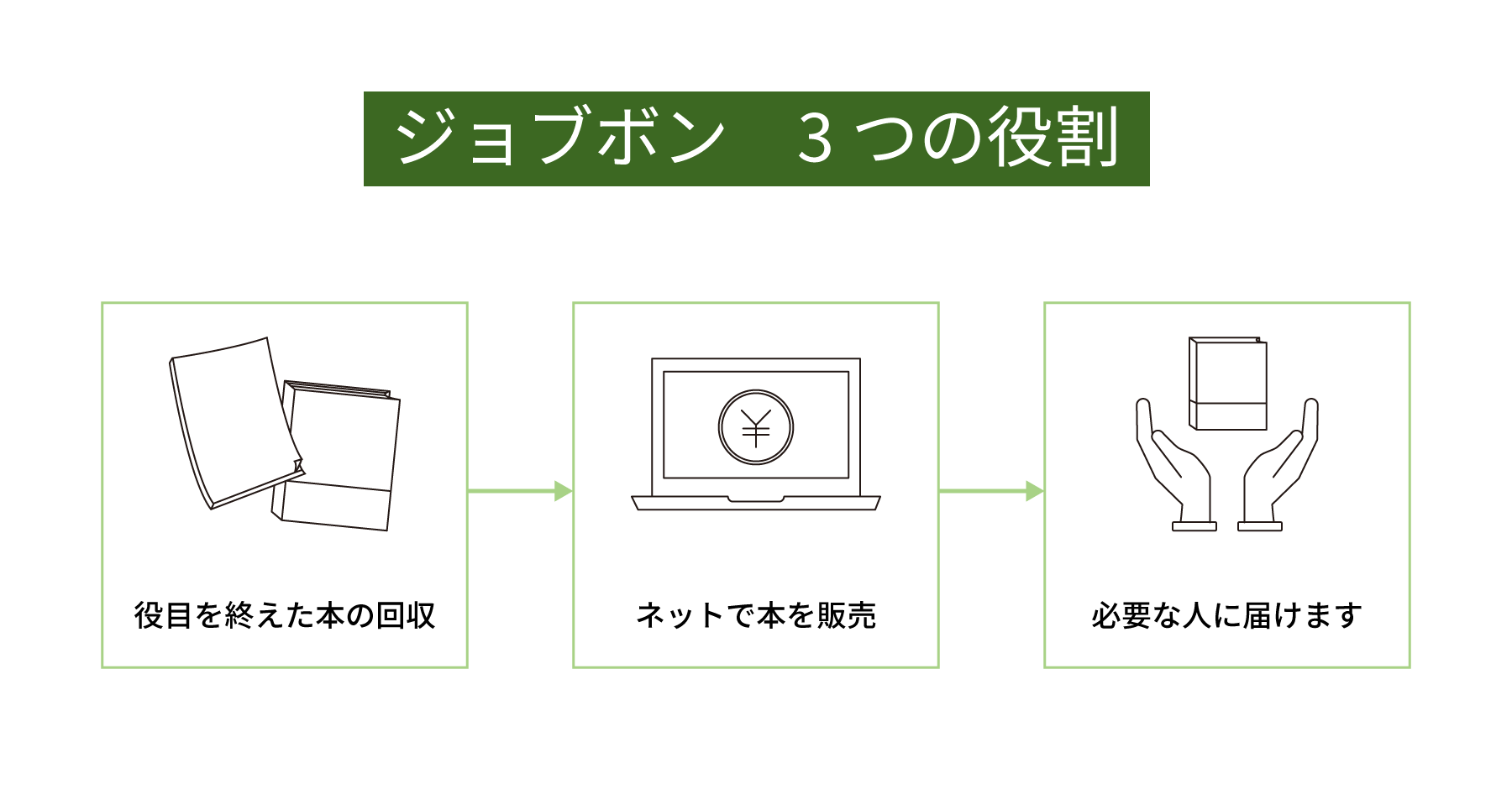 ジョブボンとはJOB(仕事)+本を組み合わせた活動名です。役目を終えた本を回収し、障がい者就労施設で再生、ネット通販を通じて、再び必要な方のお手元に届きます。その販売代金は、施設を利用している障がい者の工賃になります。本のリユースと障がい者の就労支援を合わせて行う活動です。