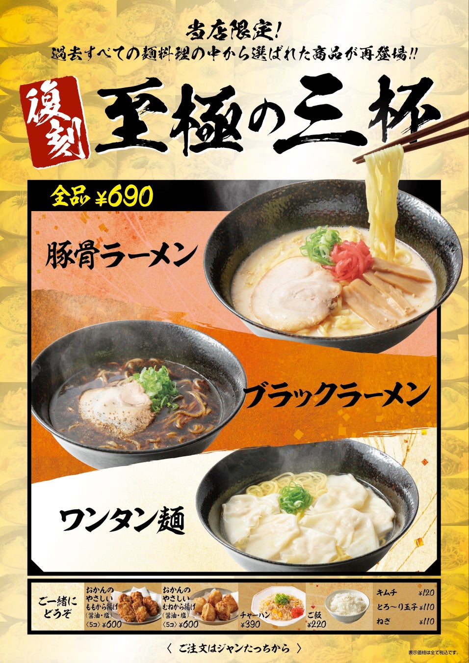 過去、ジャンカラの期間限定フードとして登場し、人気の高かったラーメン3品がみんなの塚本駅前店限定で復活。