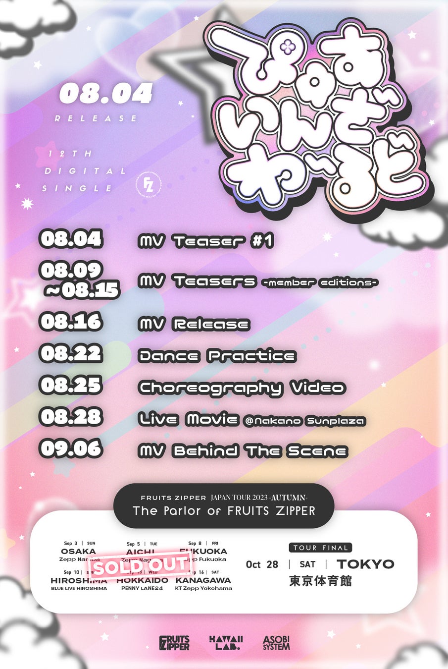 8月3日(木)発売の『週刊ヤングジャンプ』36号(集英社)にFRUITS ZIPPER特集が小冊子で封入されるほか、9月3日(日)からスタートする全国ツアーはツアーファイナルとなる東京体育館公演を残して全会場完売するなど、目覚ましい躍進を続けるFRUITS ZIPPER。グループ初のアリーナ公演となるツアーファイナルのチケットは各種先行受付中となっているので、チケットを手に入れてぜひ会場に足を運んでほしい。