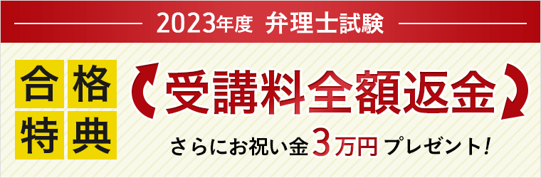 2023年合格目標弁理士試験対策カリキュラムをお申込みいただいた方が2023年度弁理士試験に合格された場合,合格特典(全額返金・お祝い金贈呈)がございます。