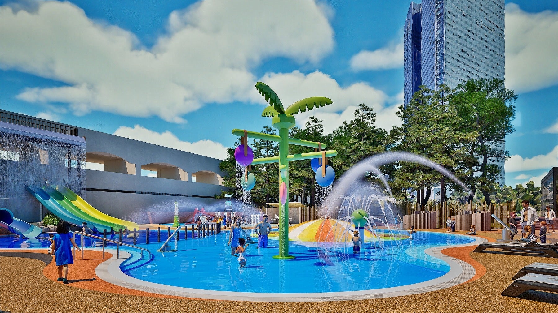 本エリアは、水遊びと遊具の要素を融合させた、親子で楽しめる体験型の新エリアです。滝の中から滑り出す2種類のスライダー「パラレルスライダー」「ループスライダー」や、シーガイアカラーを基調とした新感覚遊具「バブルヒル」など、多彩な水遊びが楽しめます。システムモールから流れ落ちるウォーターフォールを背景に、水しぶきと笑い声があふれる、これまでにない子どもの遊び場が誕生します。