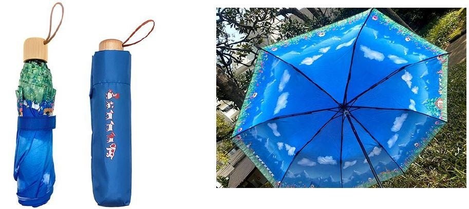 傘のフチに沿って、ハイジやヤギたちが歩く可愛い絵柄のUVカット加工・晴れ雨兼用の折りたたみ傘です。
