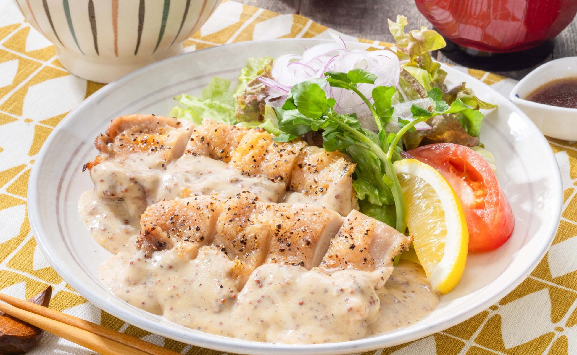 炭火でじっくり焼き上げたジューシーなチキンに、隠し味にチーズを加えたクリーミーな粒マスタードソースをたっぷりとかけました。粗挽き黒胡椒をアクセントに、チーズのコクとマスタードの辛みが絶妙に絡み合う、一度食べたらやみつきになる美味しさです。