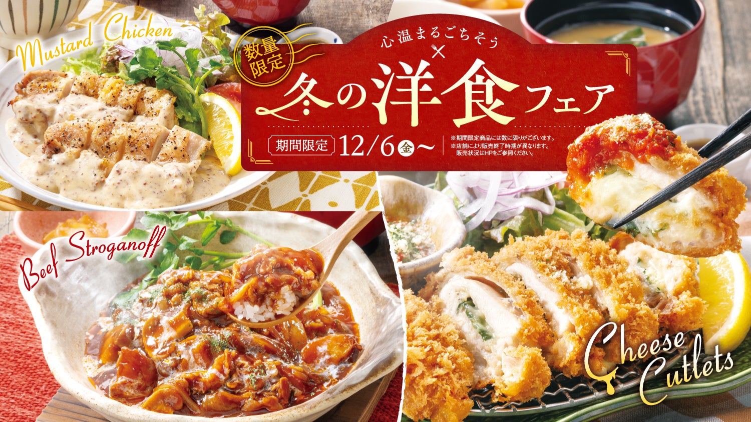 洋の風味と和のひとさじを絶妙に組み合わせた、大戸屋初の洋食フェア。とろけるチーズと大葉の香りが広がる「チキンと大葉のチーズカツレツ~トマトハーブソース添え~」(定食価格:税込1,480円)のほか、八丁味噌で仕上げた「和風仕立てのビーフストロガノフごはん」(定価価格:税込1,560円)、濃厚な粒マスタードソースが絶妙な「炭火焼きチキンのマスタードクリームソース」(定価価格:税込1,320円)。ぜひこの冬は、ご飯にもぴったりな大戸屋自慢の「洋食」をご堪能ください。