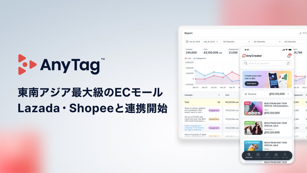 AnyMind Group株式会社(読み:エニーマインドグループ、代表取締役CEO:十河 宏輔、以下「当社」) が提供するインフルエンサーマーケティングプラットフォーム「AnyTag」と、Lazada及びShopeeとの連携を開始いたしました。