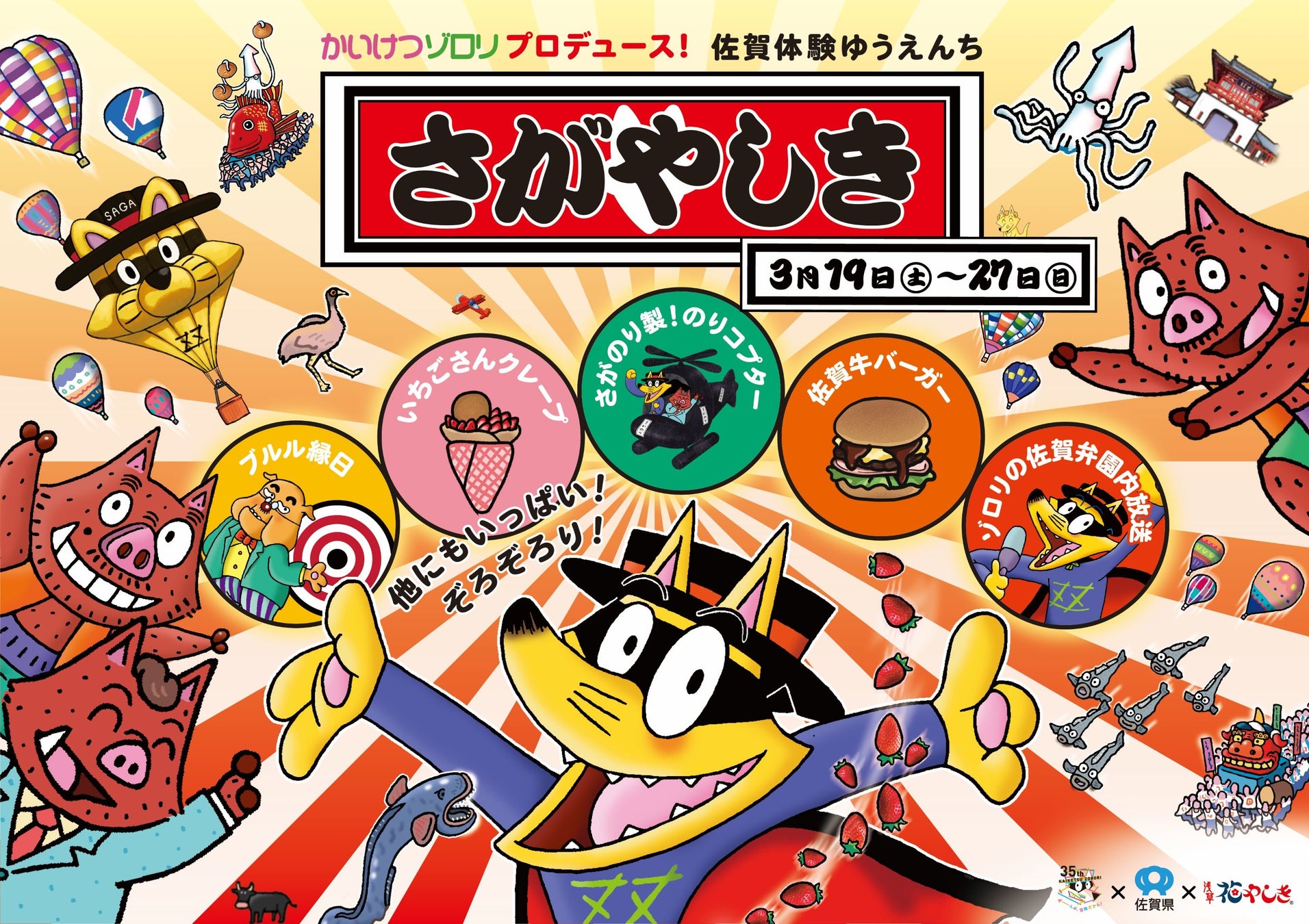 佐賀県は、県内のモノ・コトを起点に、誰もがハッとしてドキドキする“新しい驚き”をつくるプロジェクト「サガプライズ!」の一環として、累計3500万部を突破し、2022年に35周年を迎える国民的児童書「かいけつゾロリ」とコラボレーション企画を実施しています。今回、佐賀県の知られざる魅力を“まじめにふまじめ”に紹介していくオリジナルWEBストーリー「かいけつゾロリの さがさいこー大さくせん」から現実世界に飛び出した「さがやしき」が、2022年3月19日(土曜日)から27日(日曜日)の9日間限定で、『浅草花やしき』(東京都台東区浅草2-28-1)に出現します。