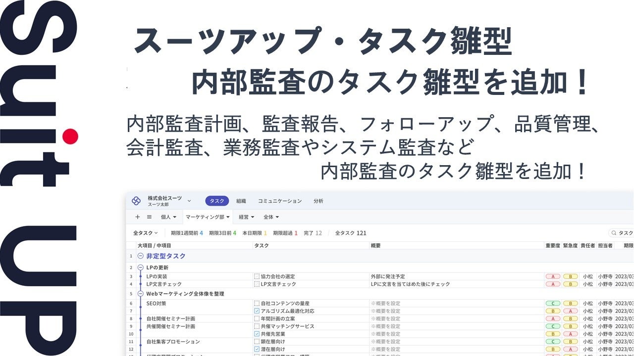 株式会社スーツ(所在地:東京都千代田区、代表取締役社長CEO:小松 裕介)は、チームでかんたん、毎日続けられるプロジェクト・タスク管理ツールの経営支援クラウド「Suit UP」(スーツアップ)に内部監査のタスク雛型を追加したことをお知らせします。