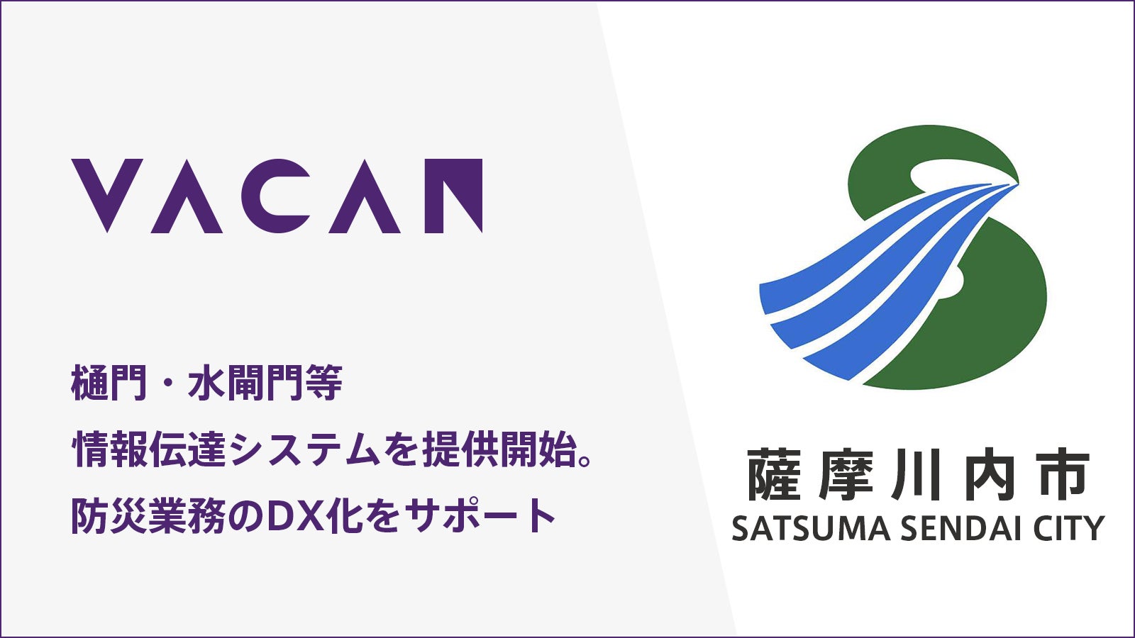 AI×IoTを活用してあらゆる「待つをなくす」スタートアップ、株式会社バカン(東京都千代田区、代表取締役:河野剛進)は、デジタル田園都市国家構想交付金等を活用した樋門・水閘門等情報伝達システムを新たに開発し、鹿児島県薩摩川内市で本日(3月24日)から運用を開始します。これにより、水門等管理業務の効率化が進むことが期待されます。