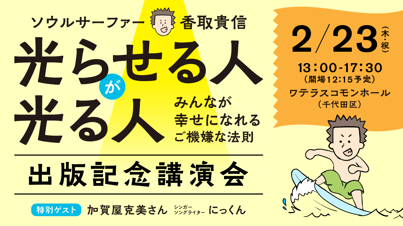 香取貴信著「光らせる人が光る人 みんなが幸せになれるご機嫌な法則」の出版を記念する講演会を、2月23日(木・祝)にワテラスコモンホール(千代田区)で開催します。