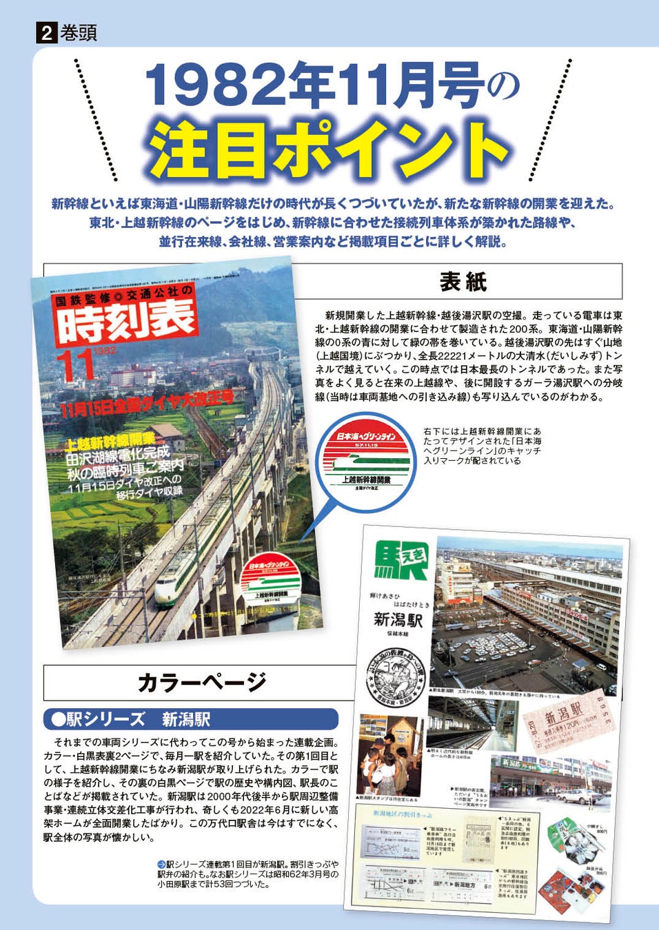 表紙にはカバーを付け、資料としても保存しやすい仕様となっています。カバーをとった表紙には当時そのままのデザインを再現。新規開業した越後湯沢駅に200系が走りこむダイナミックな構成です。本書の中で、注目するべき誌面のポイントを、元『JTB時刻表』編集長で、現在は鉄道ライター等としても活躍する木村嘉男氏が解説。より興味深く楽しめる一冊となっております。