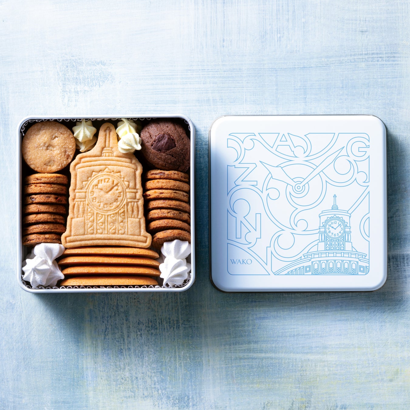 時計塔が描かれた缶を開けると、中にも時計塔のクッキーが。バターの豊かな香りとともに現れる5種のクッキーは、いずれもアトリエレシピで作られたもの。くるみ、イチジクなど素材それぞれの風味や食感を大切に生かしました。
