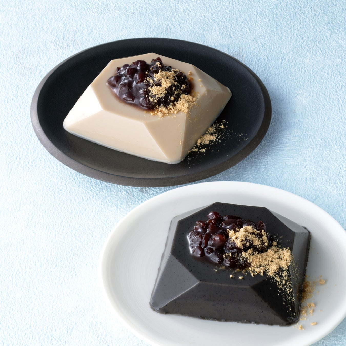胡麻豆腐と同じ製法で作った、きめ細かでもっちりとしたごまぷりんです。自家焙煎した胡麻の風味豊かなペーストに豆乳で大豆の香りも添え、白ごまと黒ごまの風味を楽しめる一品です。付属のあんこときな粉をかけると贅沢な大人の甘味に。常温保存が可能です。