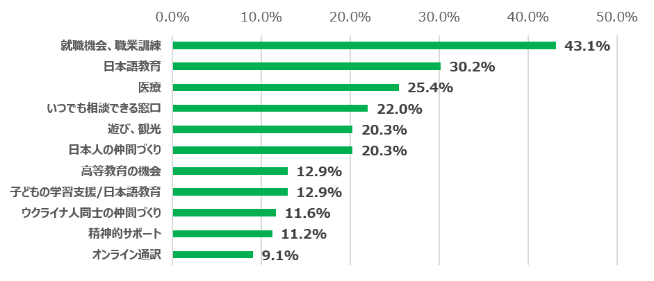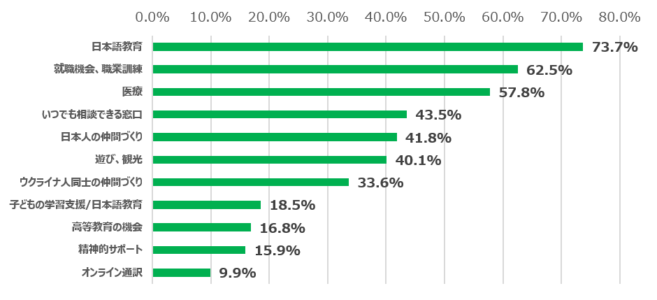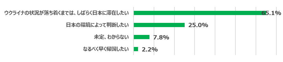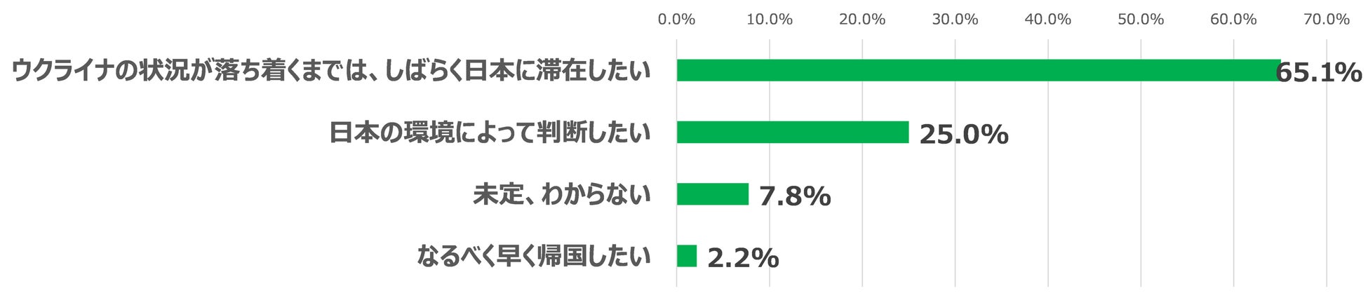 また、日本財団へ渡航費や生活費の申請を行った避難民を対象にアンケート調査を行った結果、65.1%の避難民が引き続き日本滞在を希望しています。必要なニーズとしては「日本語教育」が65.8%で最も多くなりました。また、26.9%が「眠れないことがある」「孤独を感じる」と回答するなど精神面でのサポートの必要性を示唆しています。