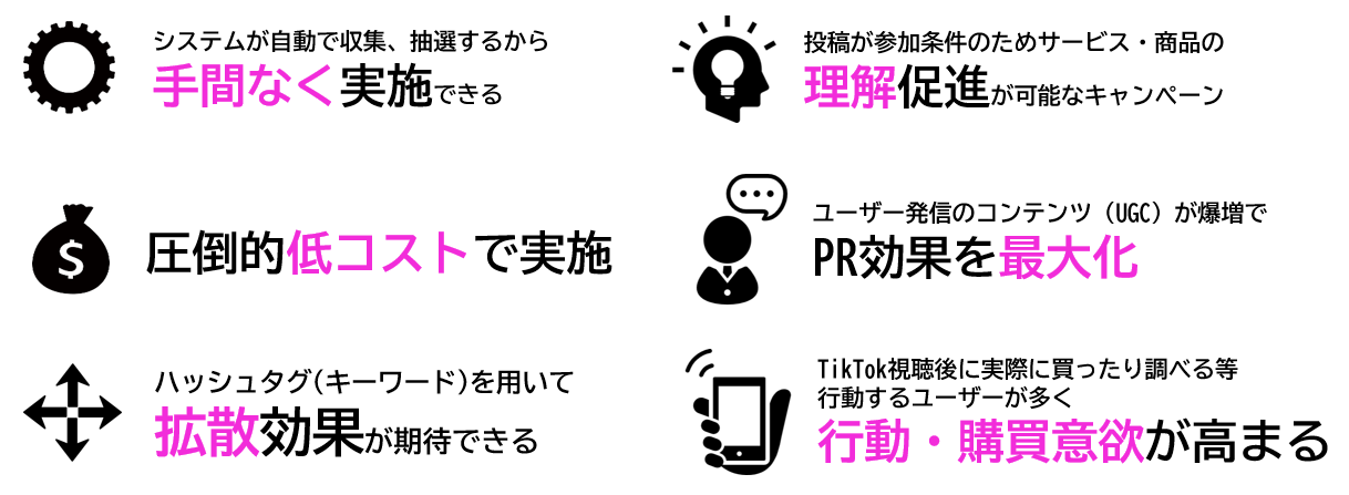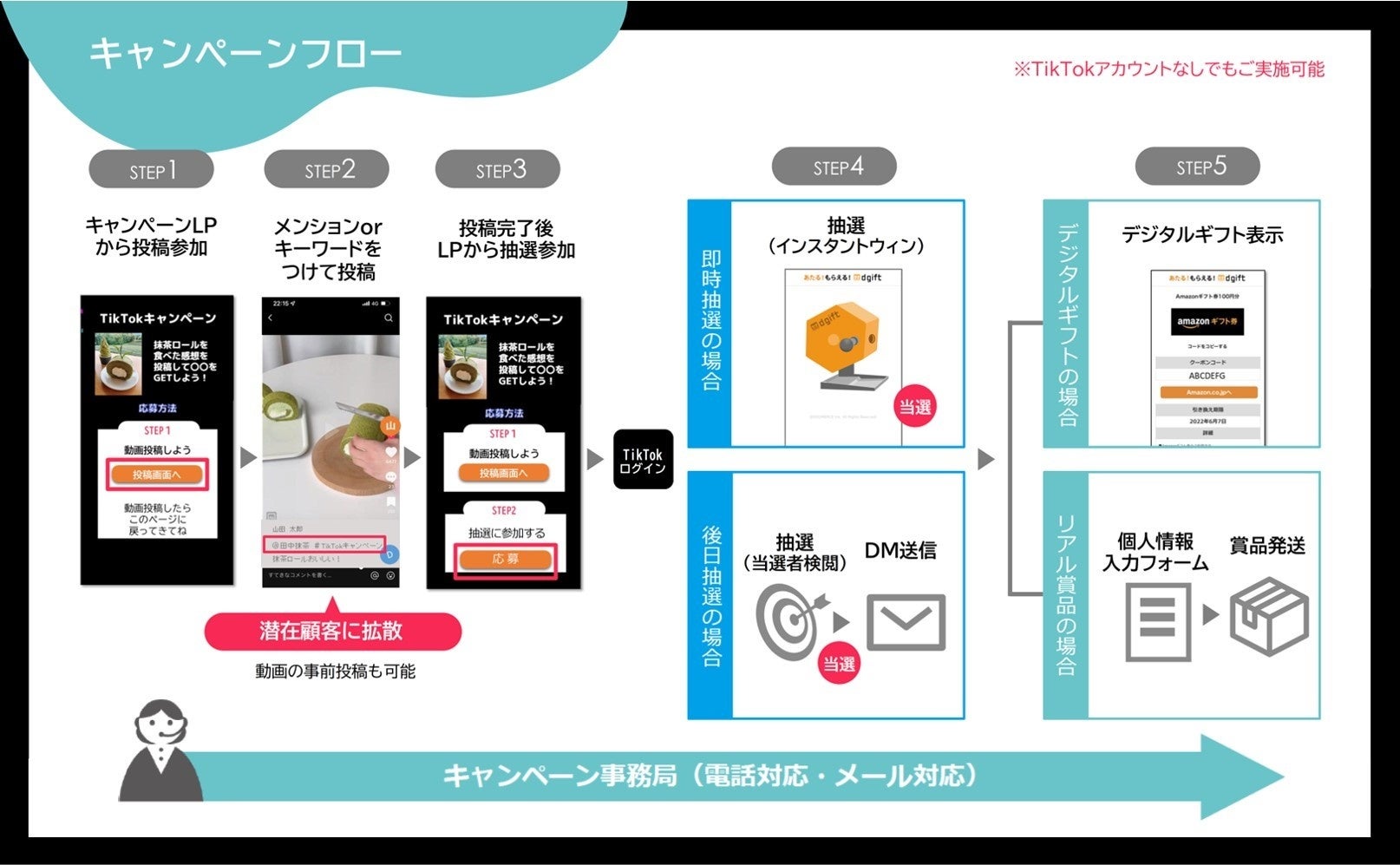 TikTok上でプレゼントキャンペーンがスムーズに実施可能です。キャンペーンの運用から、問い合わせ対応、当選管理、賞品発送など煩雑なキャンペーン事務局業務の代行までをトータルでご提供いたします。