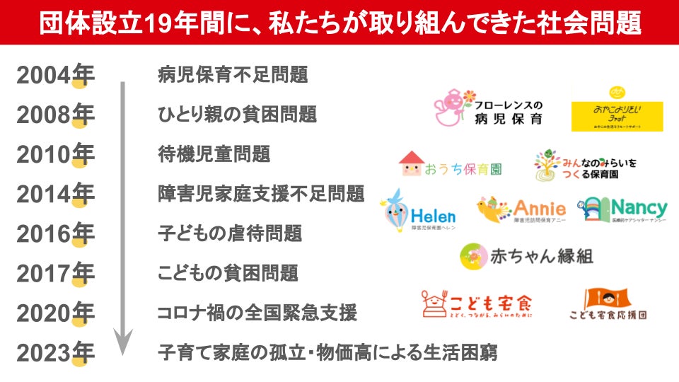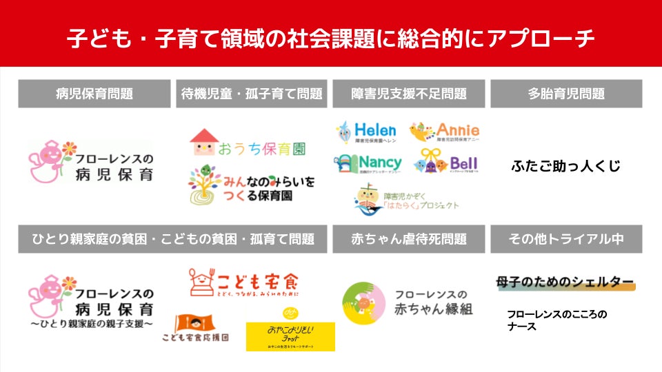 日本初の訪問型・共済型病児保育事業で2004年に設立し、子どもの虐待、子どもの貧困、障害児家庭の支援不足、親子の孤立の課題を解決するため、多様な保育事業を運営するほか、全国で「こども宅食」「おやこよりそいチャット」「にんしん相談」「赤ちゃん縁組」などの福祉事業と支援活動、政策提言をおこなっています。