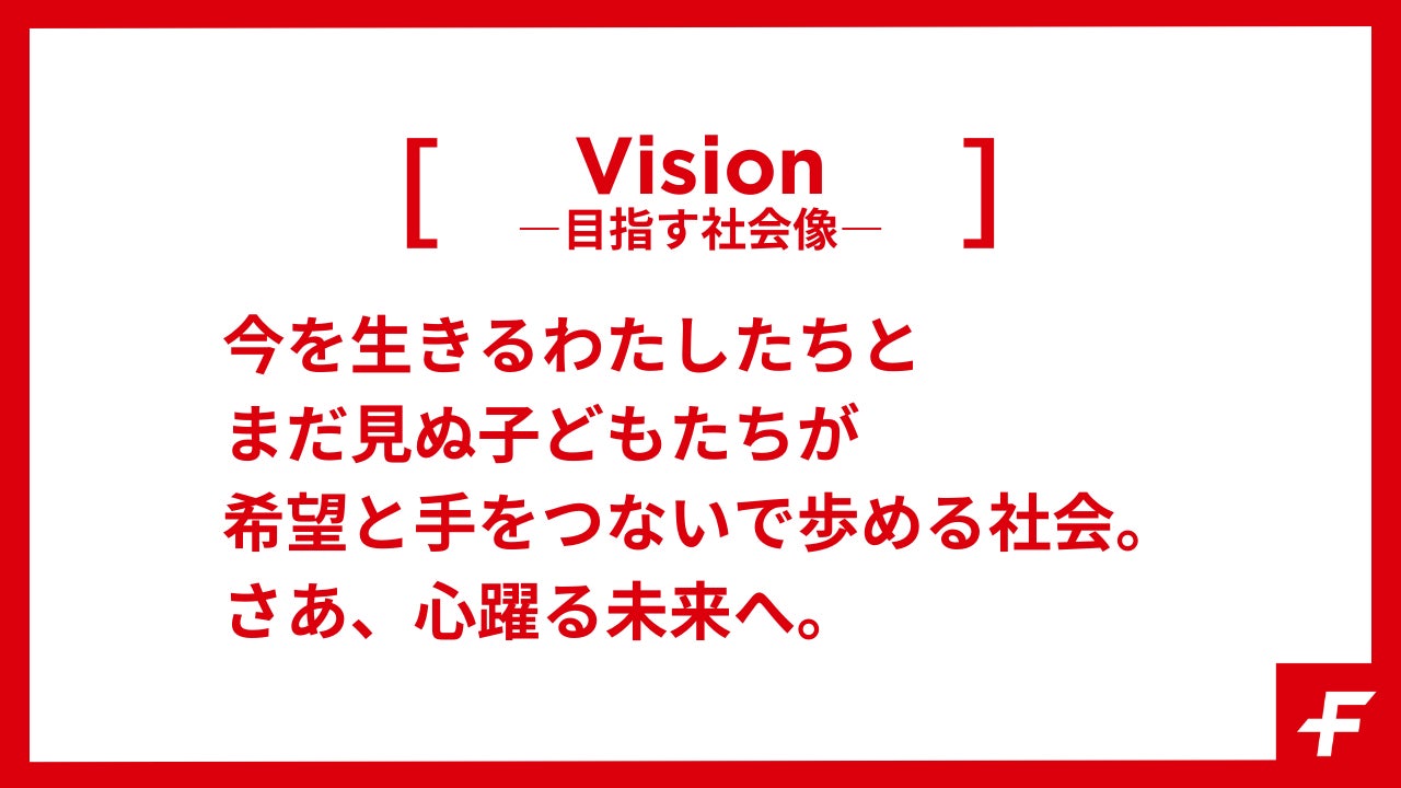 旧ビジョン「みんなで子どもたちを抱きしめ、子育てとともに何でも挑戦でき、いろんな家族の笑顔があふれる社会」と同様、子どもを社会全体で育み、大人も子どもも問わず、その人のありのままが尊重される社会を実現したいという創業当時からの理念を引き継ぎながら、今現代を生きるあらゆる「わたしたち」と、未来を生きる「まだ見ぬ子どもたち」へ、団体として取り組む領域のスコープ(範囲)の拡大と、50年後、100年後の未来まで見据えた新たな視点の設定を、新ビジョンで表現しました。