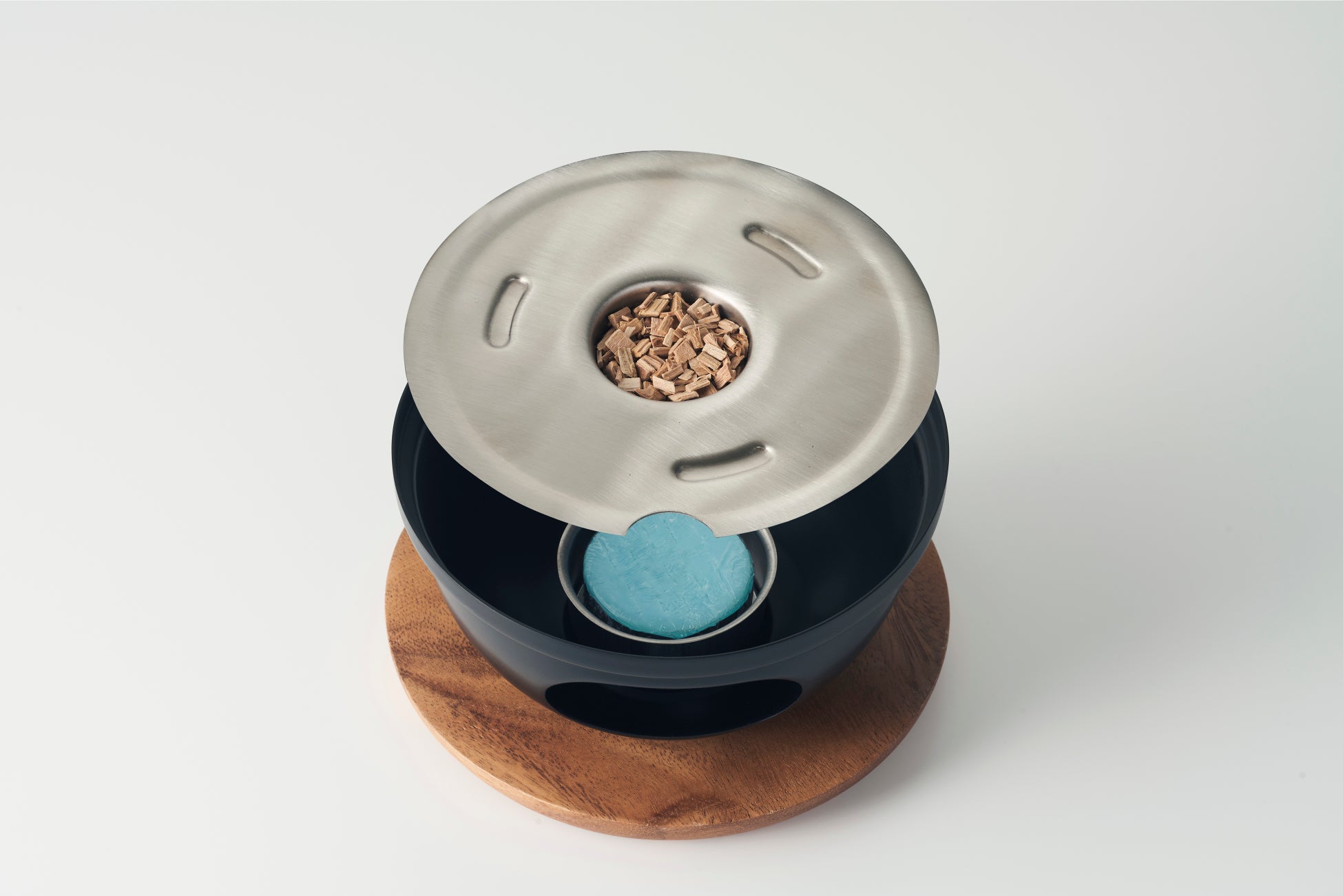 本体の台座に別売りの固形燃料をセットし、燻製チップを約1.5g乗せてから火をつけて燻します。調理が終わったら専用の火消しふたで火を消し、一定時間経過したら出来上がりです。約10~20分程度で、自宅で簡単に燻製が出来上がります。