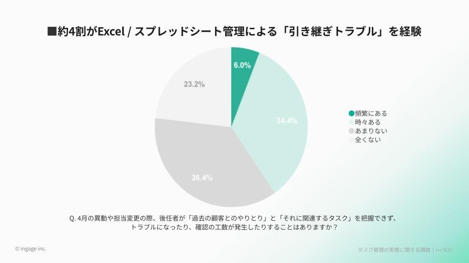 コミュニケーションプラットフォ—ム「Re:lation(リレーション)」を提供し、6,000社以上(※1)の導入実績を誇る株式会社インゲージ(本社:大阪府大阪市、代表取締役社長:和田 哲也)は、日常的にメールとタスク管理表(Excel / スプレッドシート等)を併用しているビジネスパーソン500名を対象に、「タスク管理の実態に関する調査」を実施いたしました。