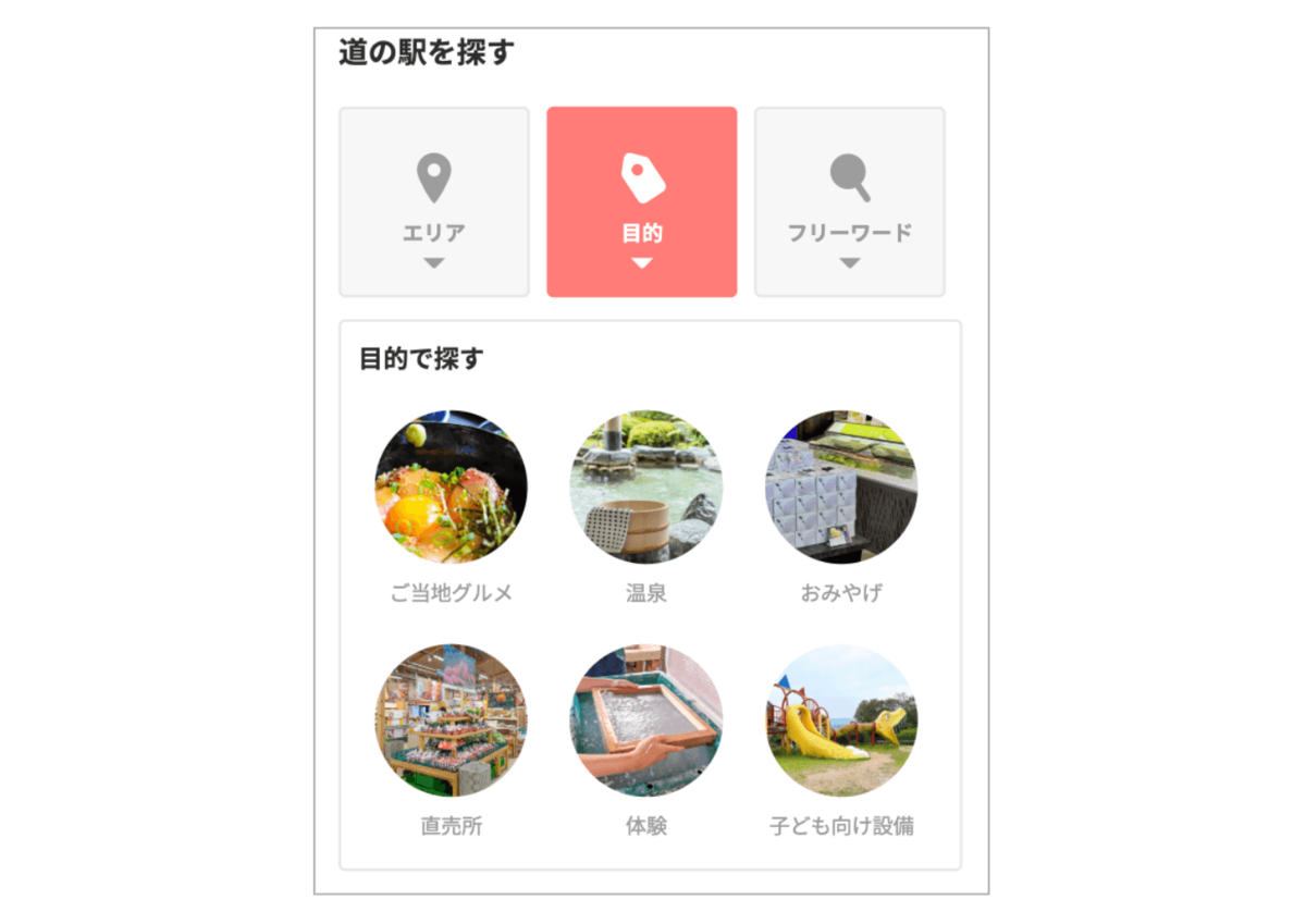 「ご当地グルメ」「温泉」「おみやげ」「直売所」「体験」「子ども向け設備」など、目的に合わせた検索ができます。