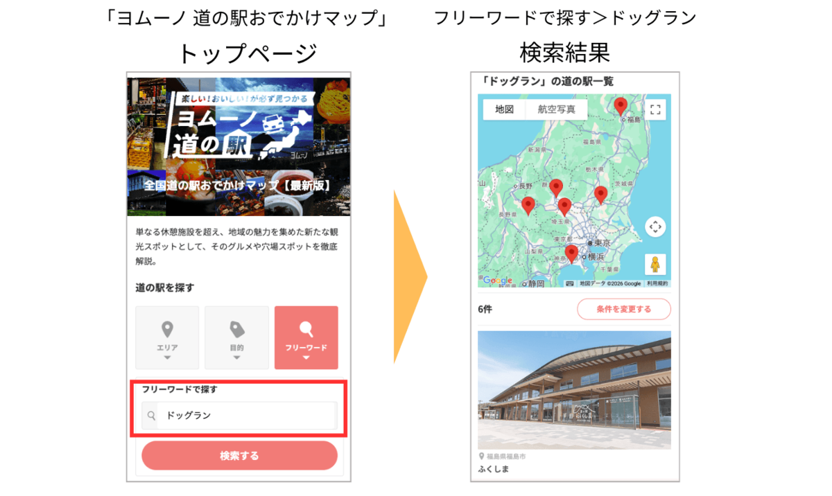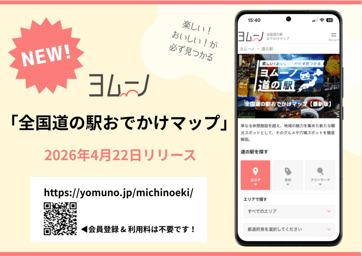 4月22日は「道の駅の日」でもあります。ますます注目が高まる道の駅の魅力を広く発信するとともに、ユーザーの皆さまが目的やシーンに合った道の駅をスムーズに見つけられるよう、本サービスを開発いたしました。ヨムーノは今後も、暮らしをより豊かにする情報・サービスの提供に努めてまいります。