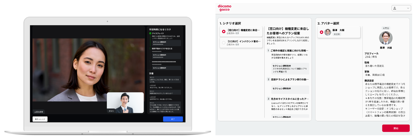 図 gaccoロープレの画面例。右はロールプレイングのシナリオを選択したり、AIアバターを変更する管理画面