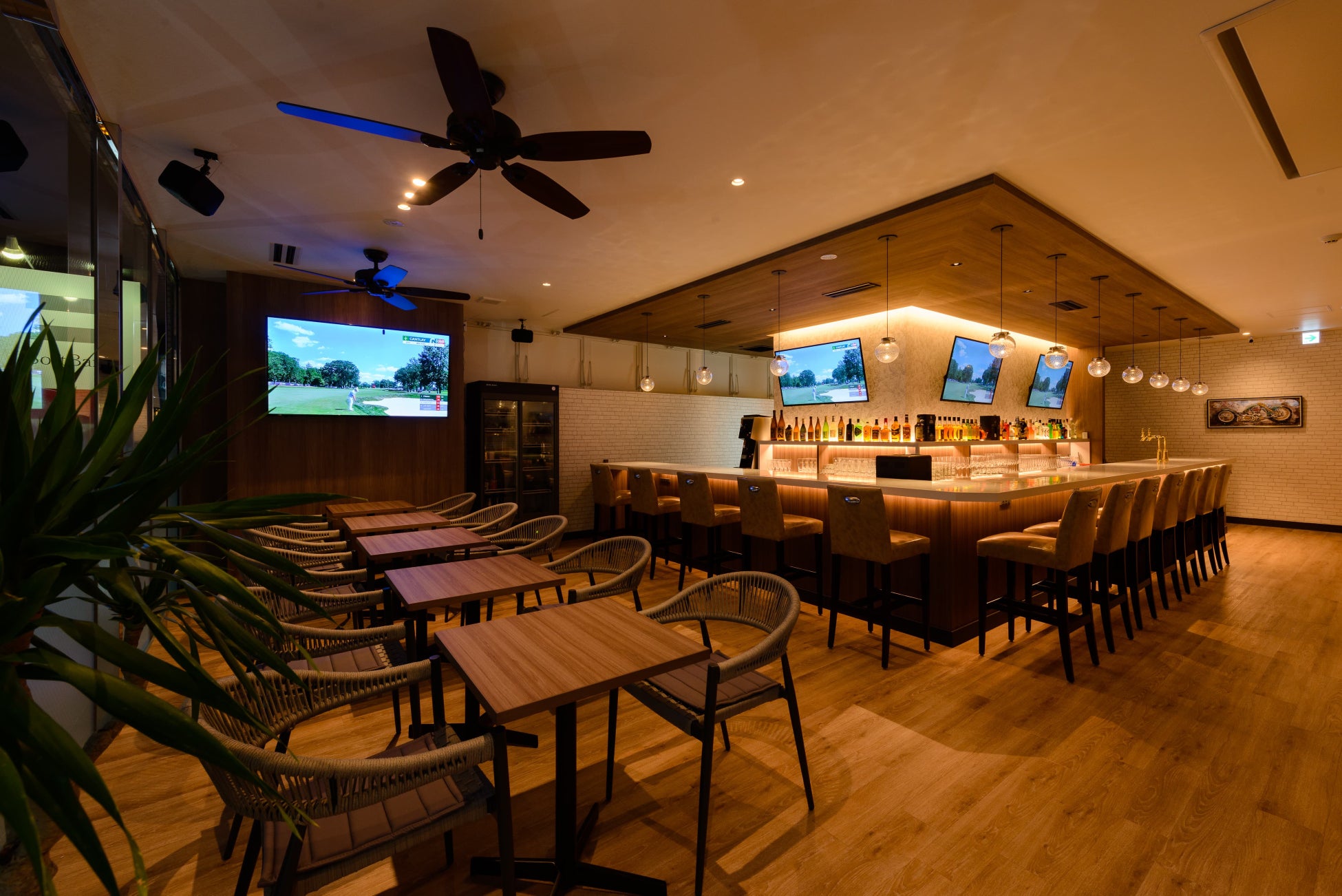 GOLF&BAR NUNIは、高性能で最新のシミュレーションゴルフが楽しめます。ゴルフに限らず、大画面のモニターではスポーツ観戦をしながらお酒と食事を楽しめます。