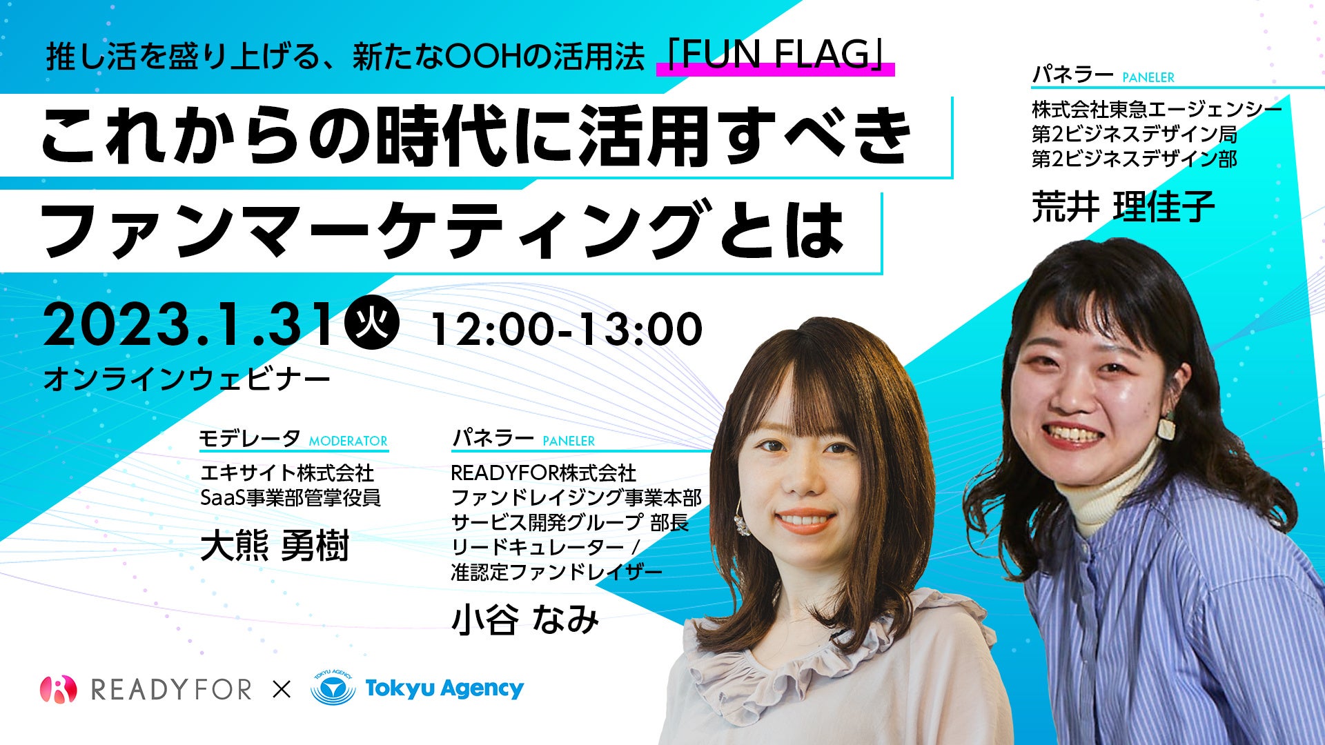 日本初・国内最大級のクラウドファンディングサービス「READYFOR」を運営するREADYFOR株式会社は、2023年1月31日(火)に、株式会社東急エージェンシーと共催ウェビナー「推し活を盛り上げる、新たなOOHの活用法『FUN FLAG』これからの時代に活用すべきファンマーケティングとは」を開催いたします。