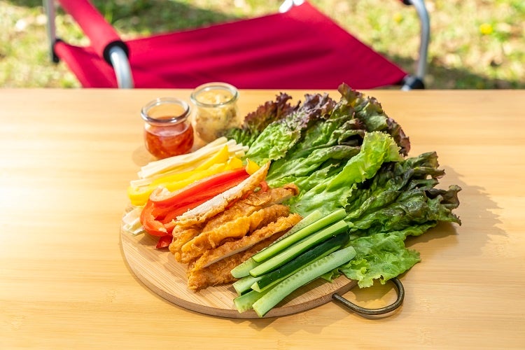 カーネルクリスピーのカリカリとした食感を活かした手巻きサラダ。スティック状にカットした野菜の瑞々しさが、チキンのおいしさを引き立てます。好きな具材を合わせられるので、こどもも楽しく食べてくれますよ。