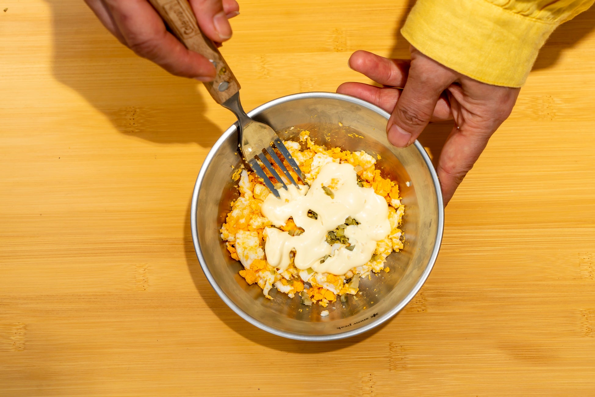 ゆで卵をつぶし小さく刻んだピクルスを加え、マヨネーズで和えれば完成です。