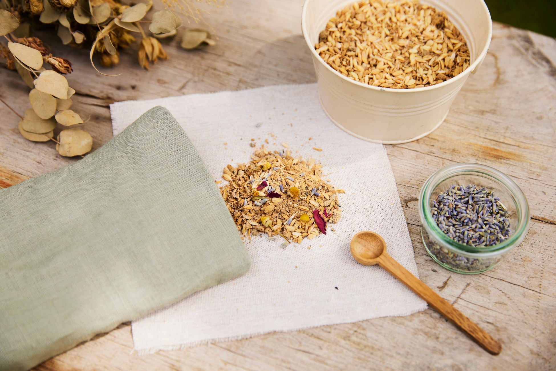ぼかし風呂につかっている間、顔まであたたまることができるよう、入浴前に「ぼかしアイピロー」を作ります。つかる前のあたたまったぼかし風呂からスコップでぼかしをすくい、専用のケースに入れてつくるアイピローです。目の上に置くことでじんわりと熱が伝わり、入浴中に顔まであたたまることができます。