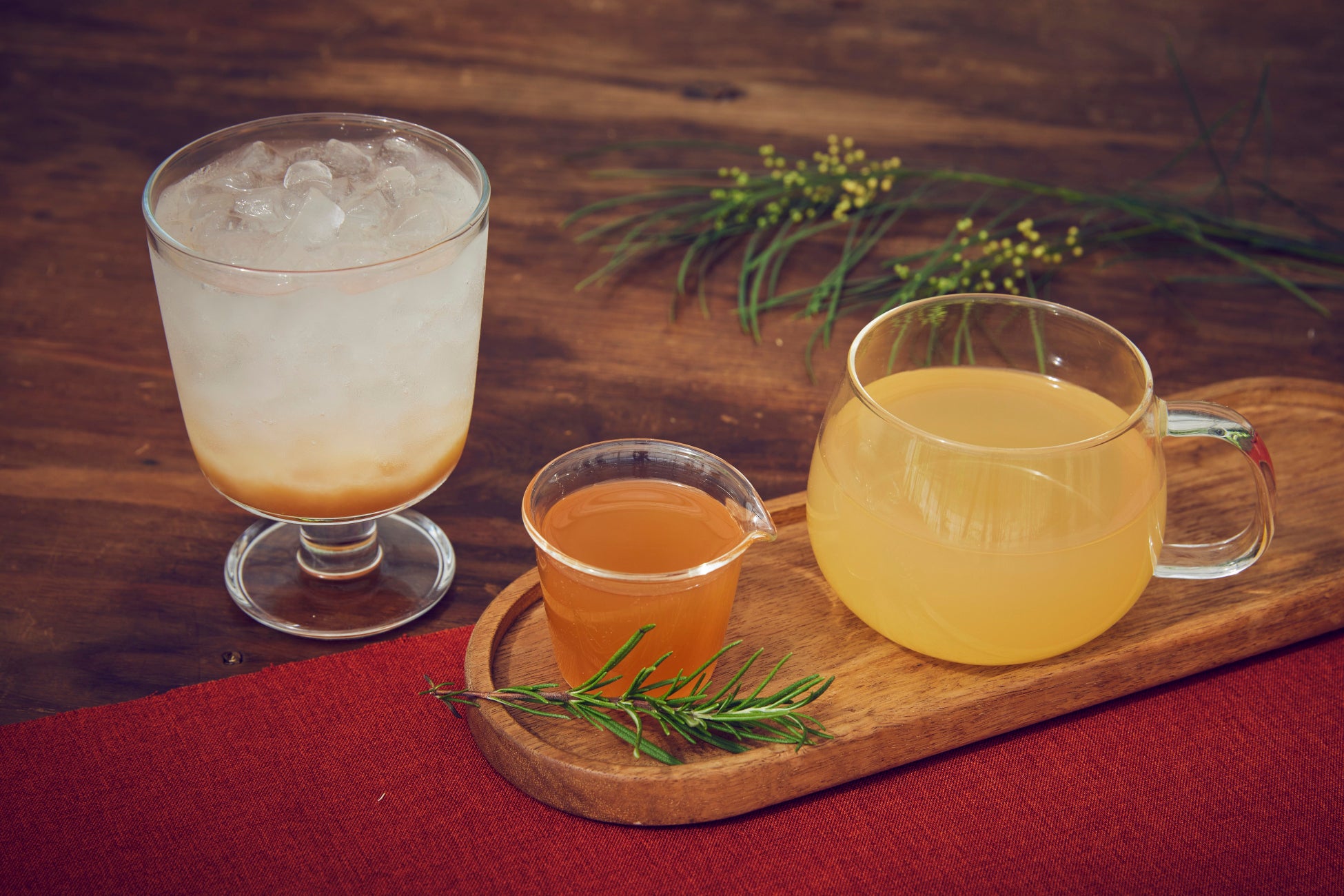 ぼかし風呂につかる前後には、水分補給を行えるようジンジャーシロップを使ったドリンクを飲みます。つかる前には、身体を内側からあたためられるよう、あたたかいジンジャードリンクを用意。つかった後には炭酸で割った冷たいドリンクを、外気浴をしながら味わいます。さらに、ぼかしバスタイムの後は、施設内の大浴場で汗を流し、開放感のある外湯で風を感じながらリフレッシュすることができます。