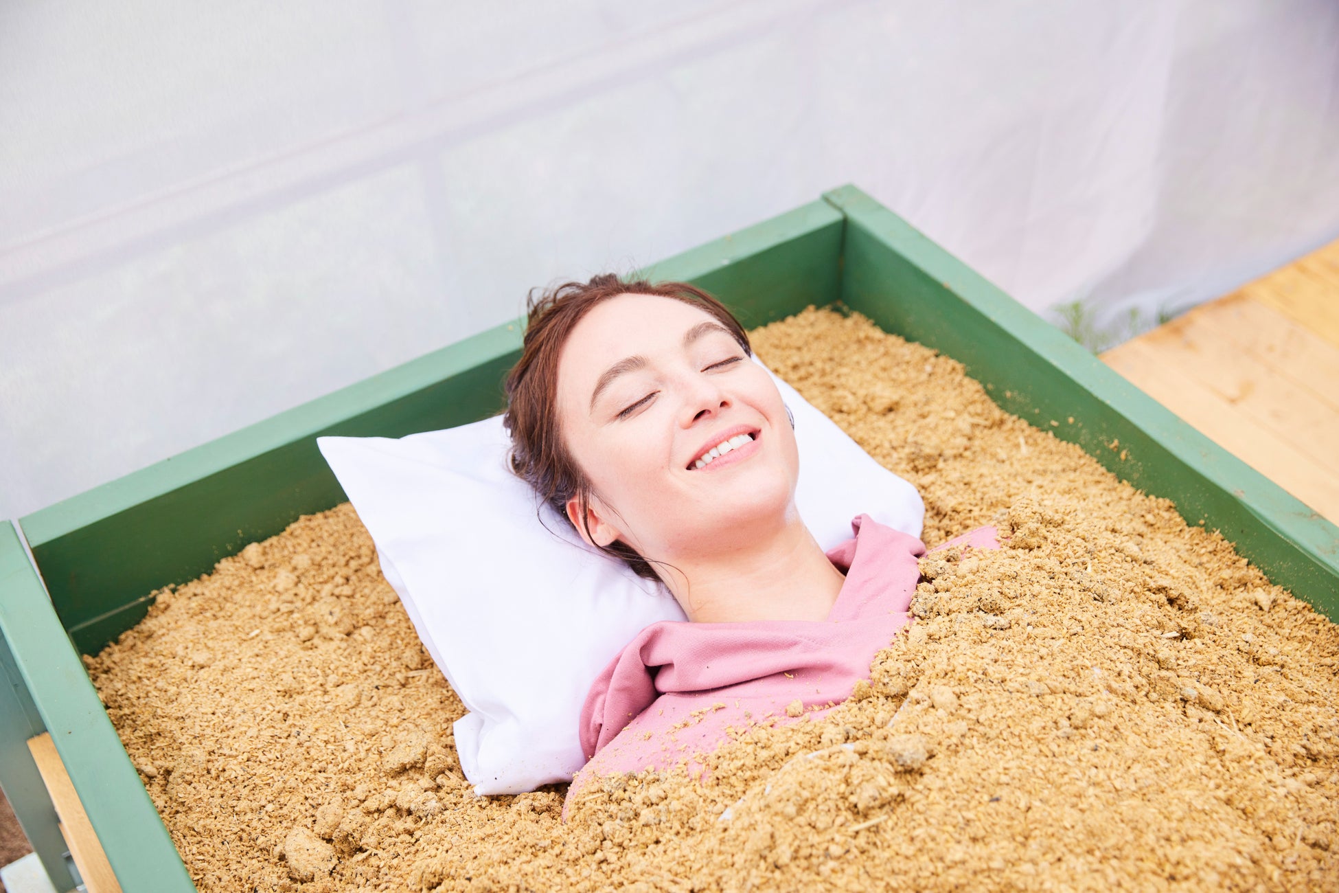 施設内の農園「アグリガーデン」に、ぼかしが入った当プログラム専用のお風呂を用意。最大50℃前後まで温度が上がるぼかし風呂の中に全身つかることで、身体がじんわりとあたたまります。今年はぼかし風呂を設置する専用ぼかしバスルームが、オリジナルの柄でデザインされ、温もりを感じる空間でリラックスしてバスタイムを愉しむことができます。