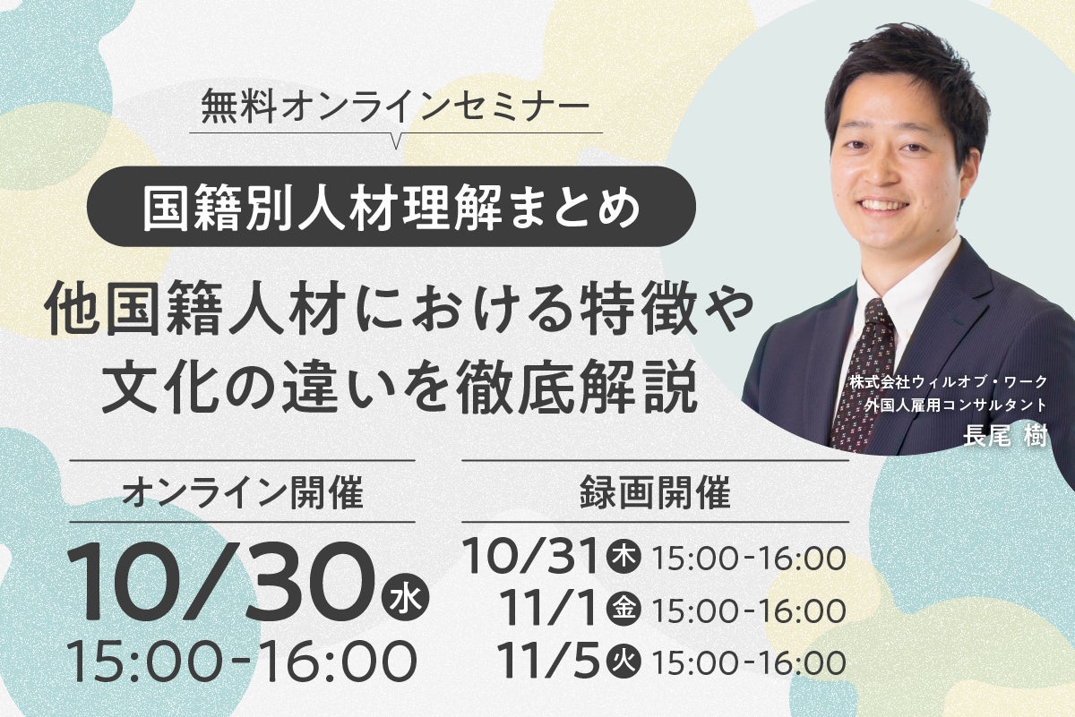 ウィルグループの総合人材サービスを手掛ける株式会社ウィルオブ・ワーク(本社:東京都新宿区、代表取締役社長:村上 秀夫)は、無料オンラインセミナー『【国籍別人材理解まとめ】他国籍人材における特徴や文化の違いを徹底解説!』を、2024年10月30日(水)に開催します。