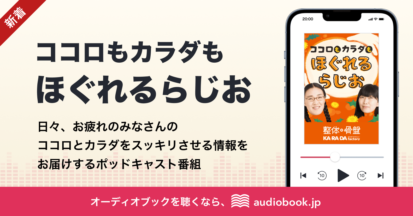 日本一のオーディオブック書籍ラインナップ数(※1)を配信する「audiobook.jp」を運営する株式会社オトバンク(本社:東京都文京区、代表取締役社長:久保田裕也、以下「オトバンク」)は、日々、お疲れのみなさんのココロとカラダをスッキリさせる情報をお届けするポッドキャスト番組『ココロもカラダもほぐれるらじお』を、3月1日(水)からオーディオブック配信サービス「audiobook.jp」、Apple podcastなどで配信スタートします。番組メインMCは、お笑い芸人たんぽぽの白鳥久美子さんと川村エミコさん。コロナ禍で増えた在宅デスクワーク等で凝り固まったカラダをスッキリさせるお手伝いをします。