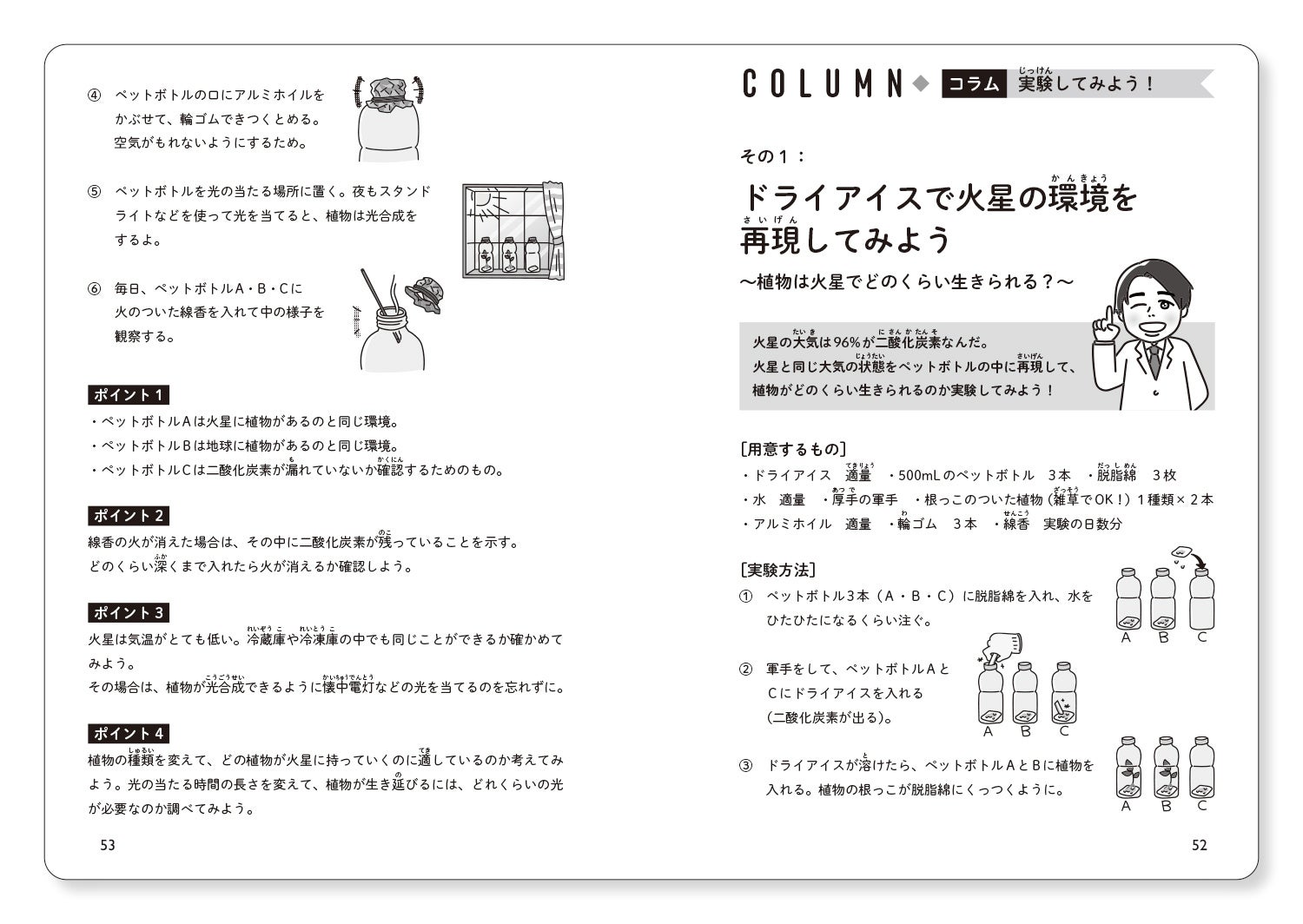 コラムでは自由研究のヒントにもなる、村木さんおすすめの、自宅でもできる実験方法や、火星のおもしろ知識が学べるクイズなども掲載されています。