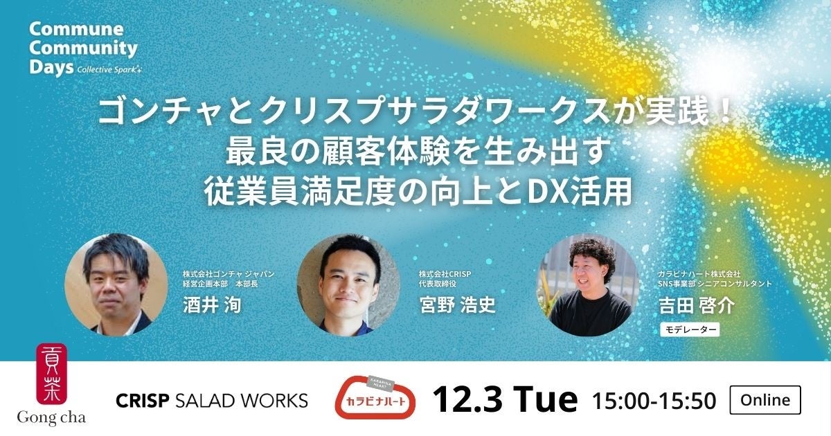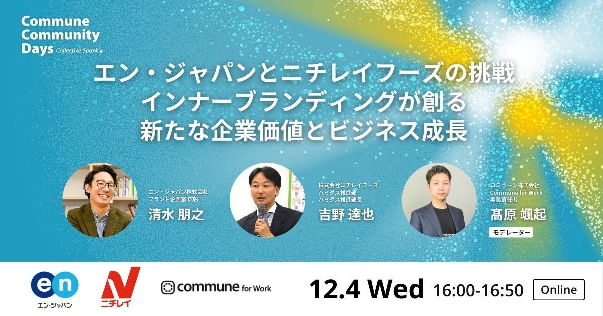 コミュニティサクセスプラットフォーム「Commune(コミューン)」を提供するコミューン株式会社は、2024年12月3日(火)・4日(水)の2日間に渡り、コミュニティに関わる全ての方に向けた参加費無料のオンラインカンファレンス「Commune Community Days Collective Spark -多様なつながりから生まれる、共創と発展の未来-」を開催いたします。この度、追加登壇者とセッション概要が決定いたしましたのでお知らせいたします。