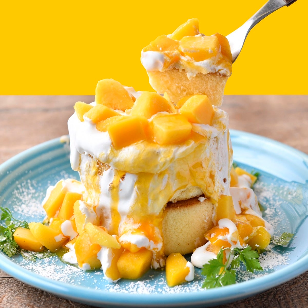 一口食べれば、しっとりと焼き上げたパンケーキとミルキーなバニラホイップ、芳醇なマンゴーの果肉がとろけだし、口の中で一体に。思わず笑顔も溢れるスイーツ時間をお届けします。