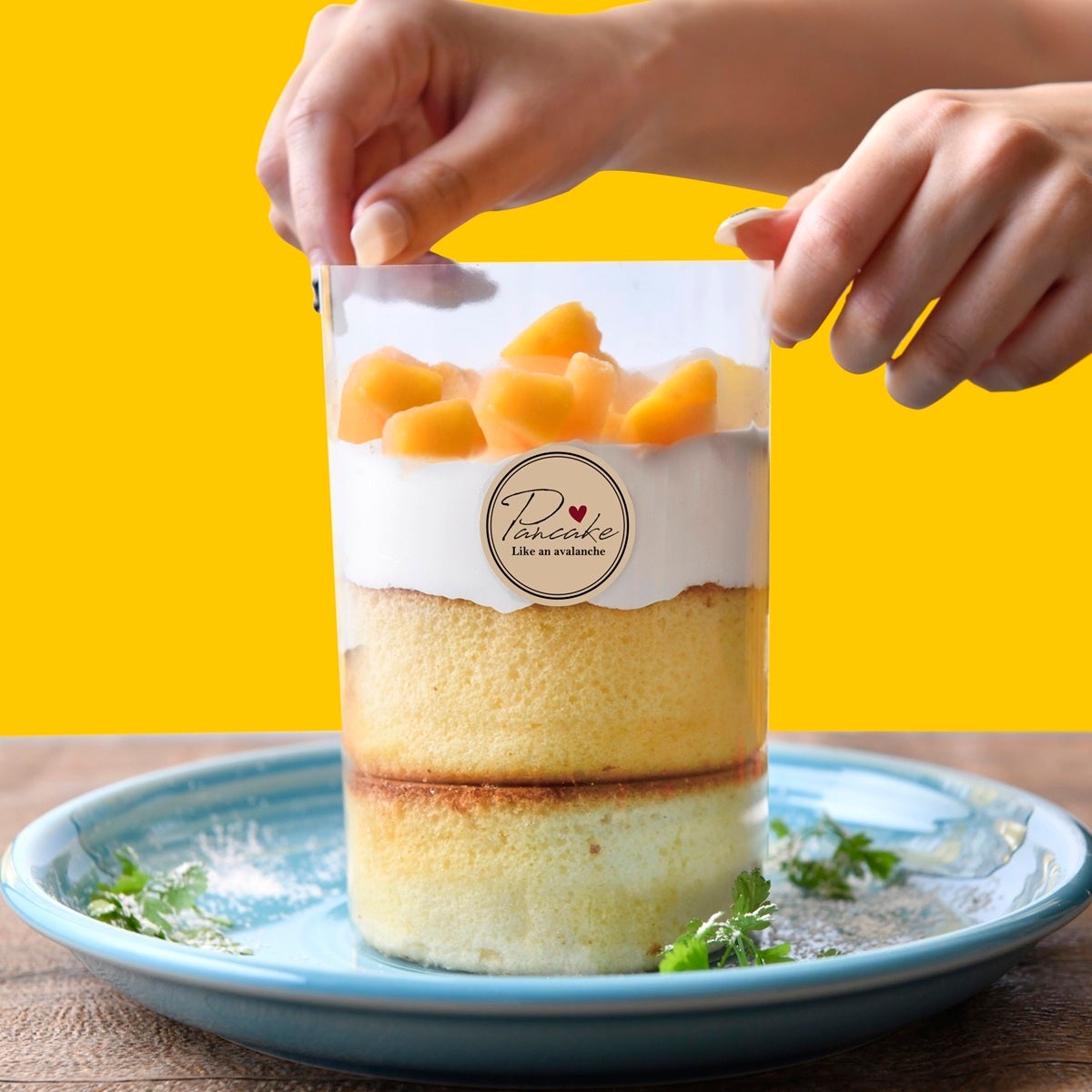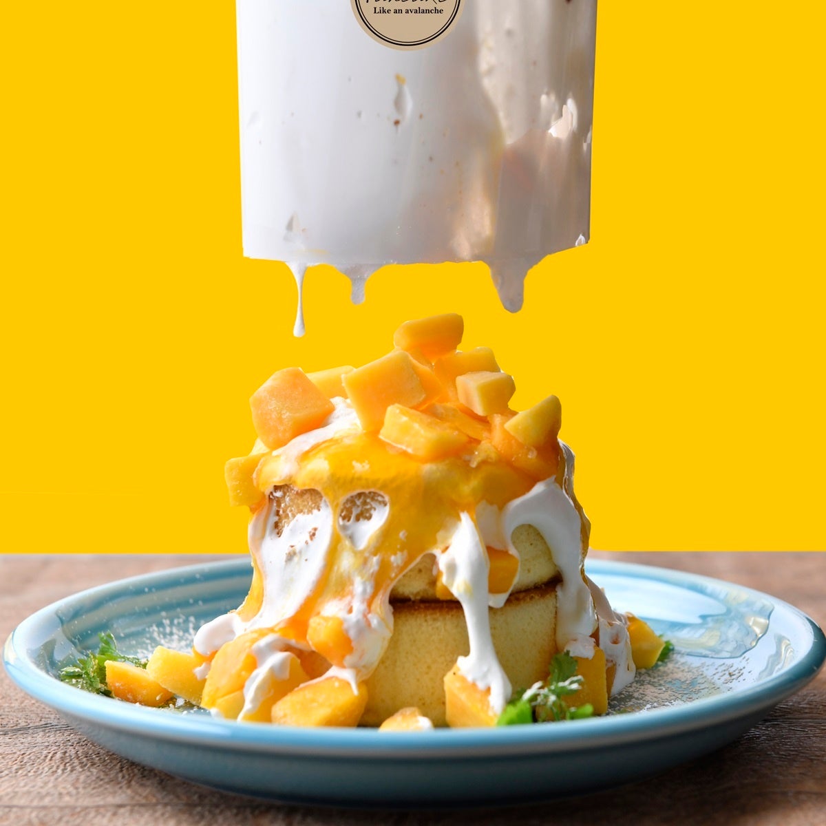 見て楽しい!食べておいしい!”完熟マンゴー”をふんだんに使用した『雪崩まくるマンゴーパンケーキ』。ジュ~シ~でとろけるような完熟マンゴーと飲めるほどにとろっとろなバニラホイップをギュギュッと閉じ込めた透明フィルムをそっと外すと…、