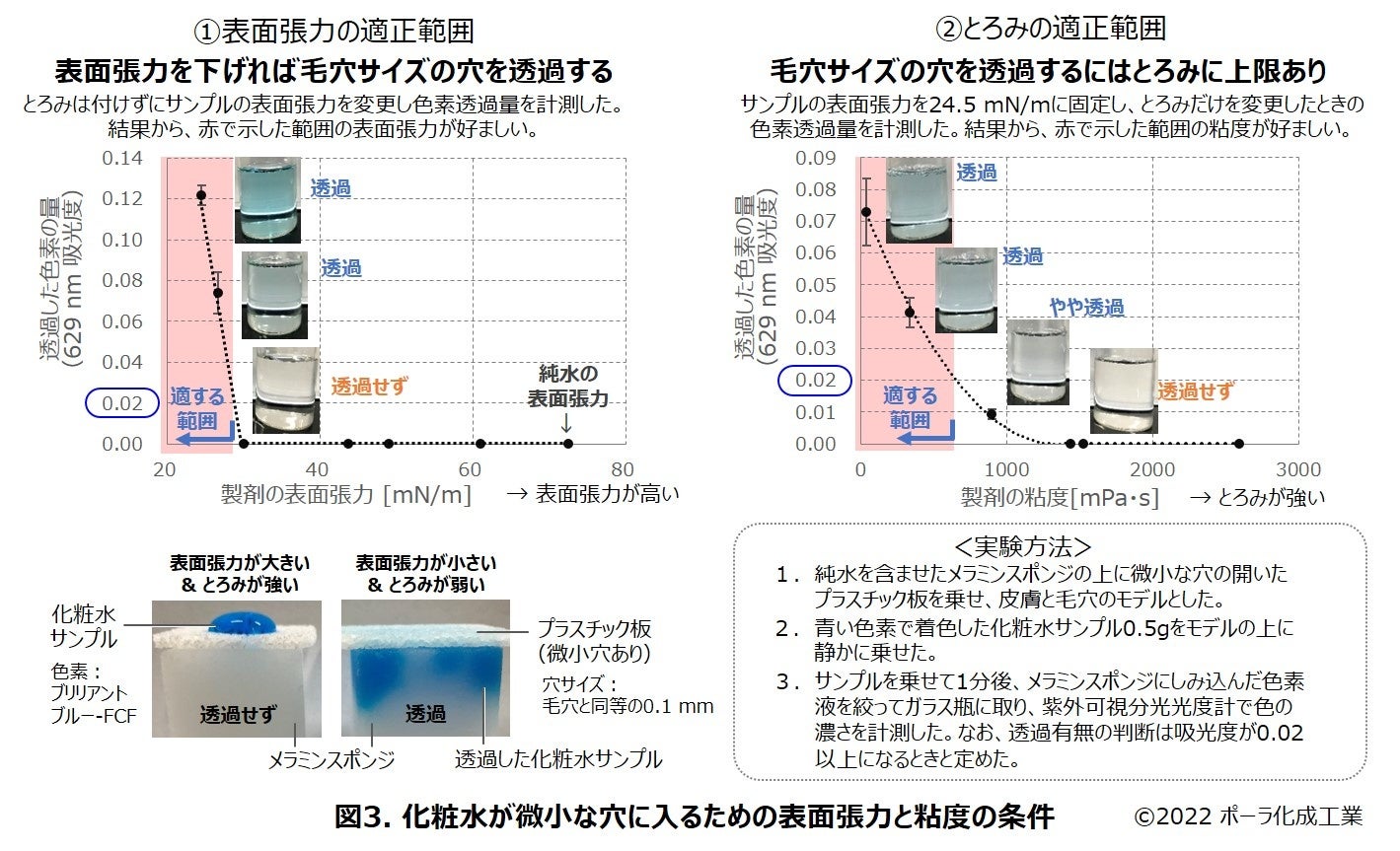 植物エキスなどの多くは水溶性であり、それらを配合しやすいのは水をベースとする化粧水などの製剤であることから、ポーラ化成工業は化粧水を対象として毛穴に浸透しやすくするための条件について研究しました。